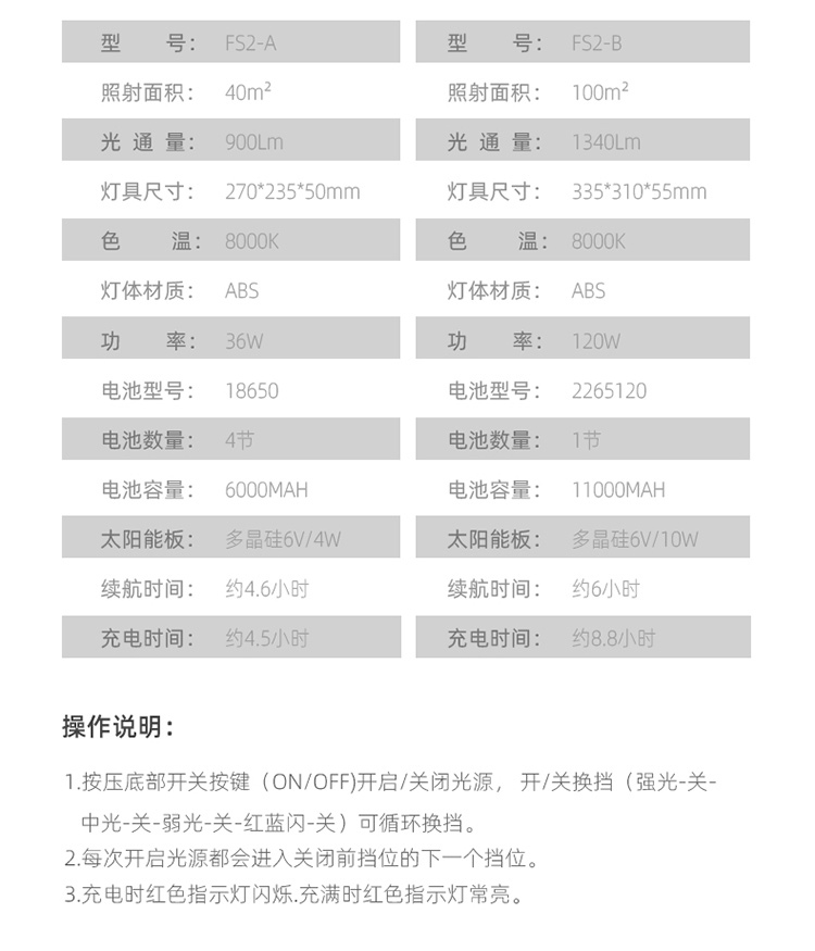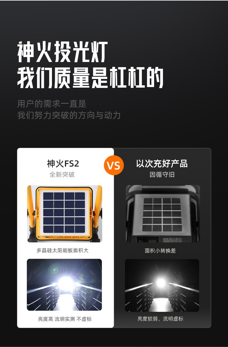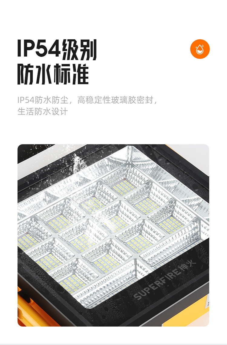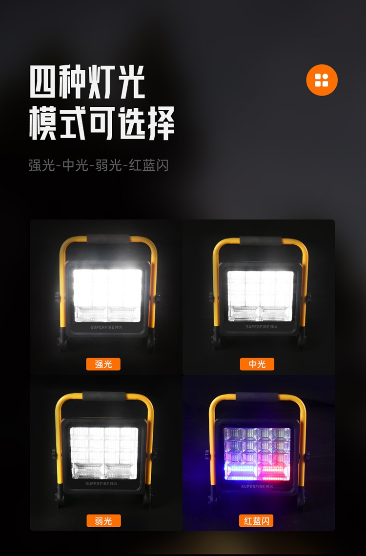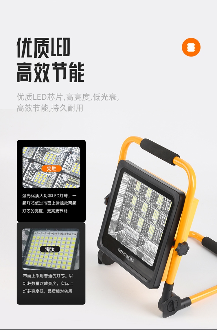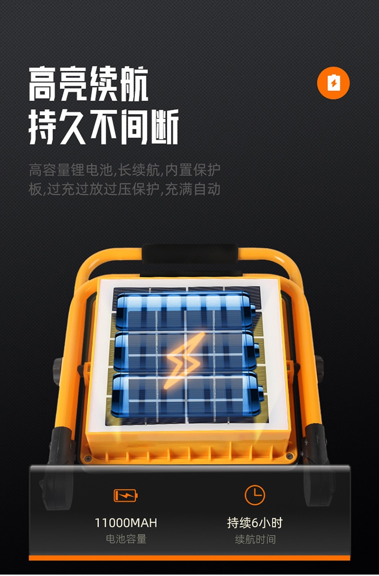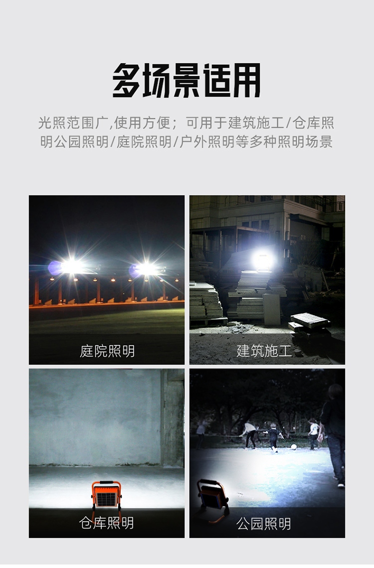 1、優質加厚ABS,精工細作,用料扎實,耐腐蝕,防生銹; 2、此款投光燈可支持太陽能充電,也可連接電源直接充電; 3、自帶便攜移動把手可180度折疊及360度旋轉