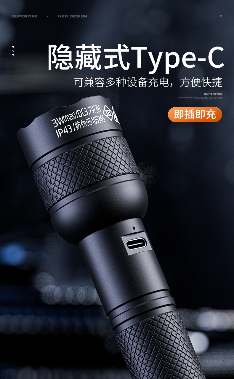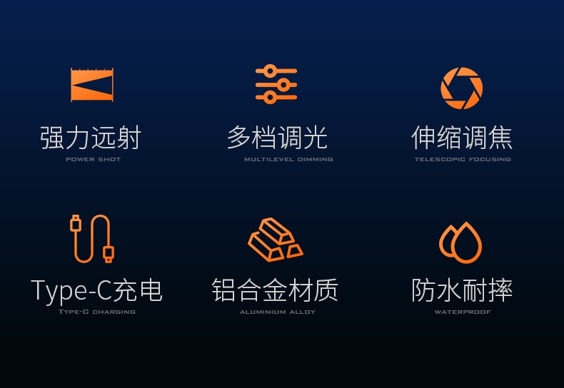1.多檔調光,可滿足不同環境下的照明需求。 2.推拉燈頭,可實現伸縮調焦。 3.Type-c充電口,兼容市面通用充電線。