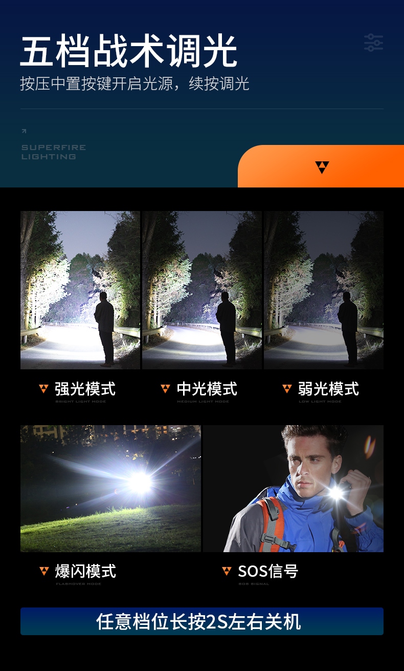 1、六檔調光,可滿足不同使用場景下的照明需求。 2、進口高亮朗明納斯燈珠,照明效果更好。 3、含檔位記憶,任意檔位快捷關機 ,開機恢復關機前檔位。