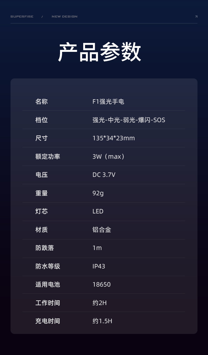 聚光主燈 亮度隨心 輕按后端開關按鈕,主燈強光點亮,續按依次切換主燈工作光-爆閃光。主燈開啟狀態下長按5秒,可實現光源色溫轉換。主燈關閉狀態下長按5秒,可開啟燈具最亮照明模式。 爆亮強光 亮如白晝 1500LM大功率高亮光源,點亮頃刻如白晝