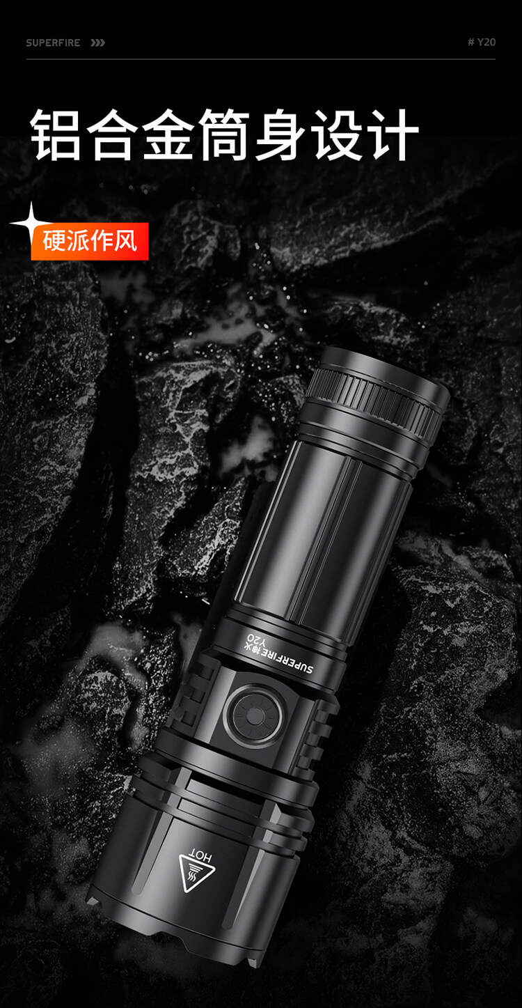 不論是更專業(yè)多功能的Y2、Y5,還是更輕省便攜的Y20、Y28,皆能通過單手推拉來實現(xiàn)伸縮調(diào)焦,隨心所欲調(diào)節(jié)手電的聚光與泛光,遠(yuǎn)景近景輕松拿捏。