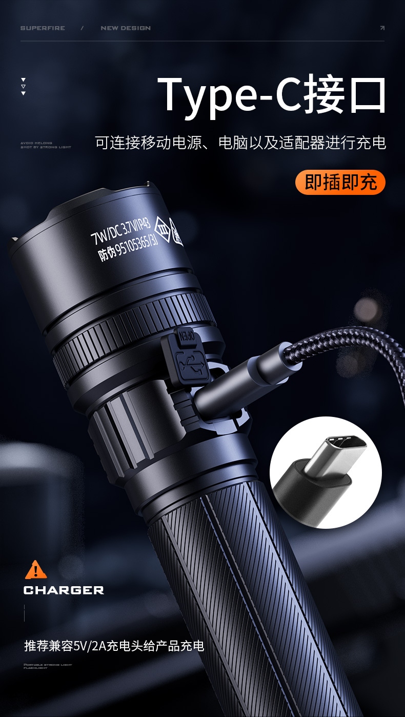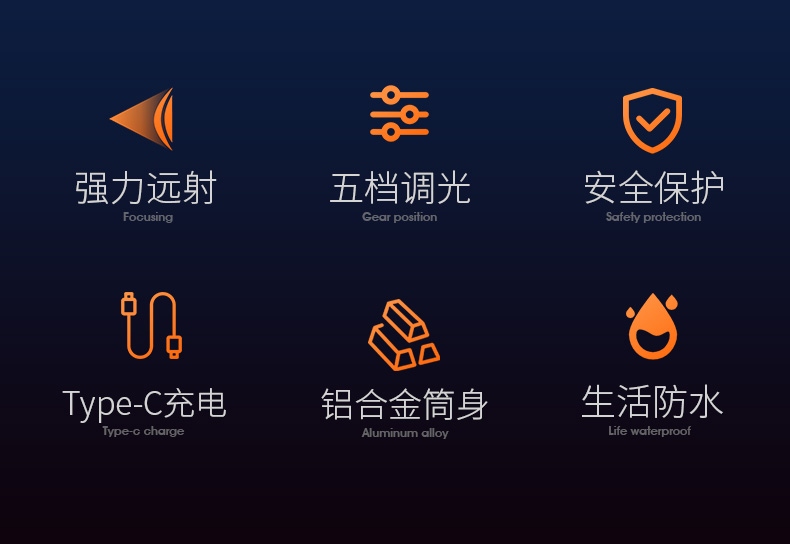 1.定焦遠射,視野清晰更聚光。 2.多重安全程序,有效延長使用壽命及時間。 3.多電池兼容,兼容21700/3AAA電池。