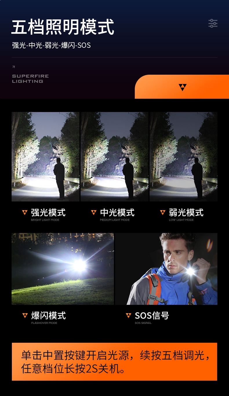 1、六檔調光,可滿足不同使用場景下的照明需求。 2、進口高亮朗明納斯燈珠,照明效果更好。 3、含檔位記憶,任意檔位快捷關機 ,開機恢復關機前檔位。