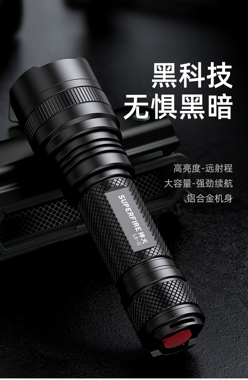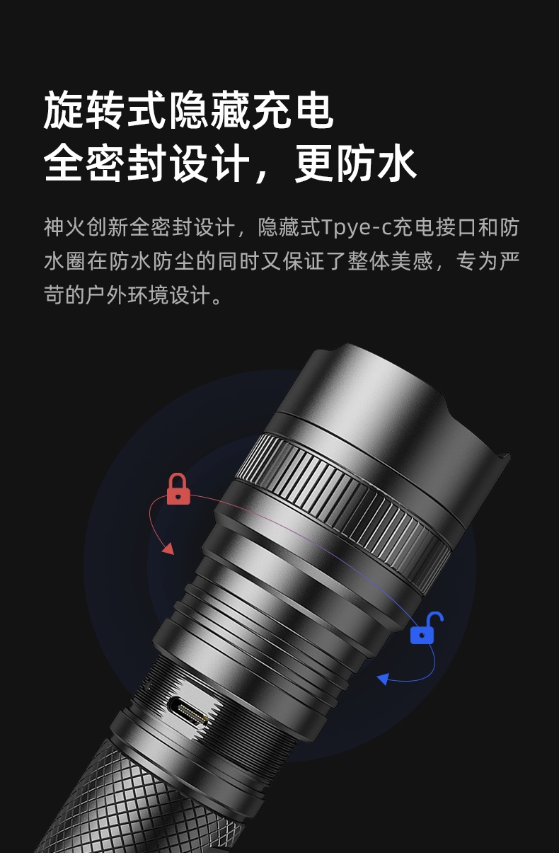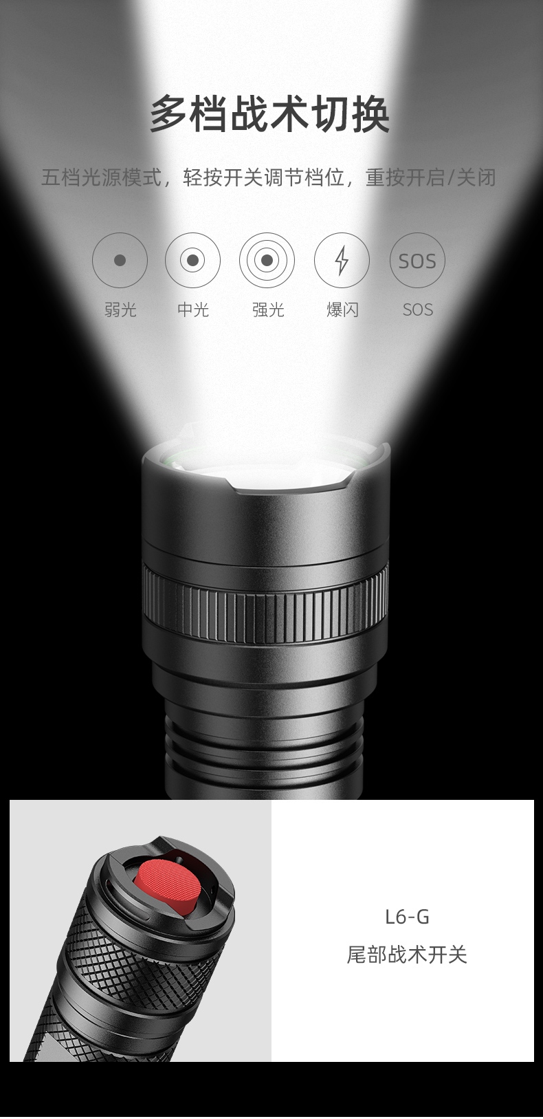 高亮燈珠 強勁輸出,照射范圍廣,250m強光遠射 尾部戰術開關,操作方便 多種光學檔位,滿足不同需求 持久續航,大容量電池 高等級防水,安全使用,不懼風雨 方形筒身,手感更舒適,舒適手感。
