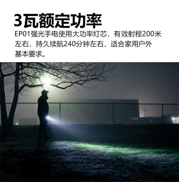 麻雀雖小五臟俱全,EP01堪稱小身材大能量。強光照明檔位下,射程可達200m之遠,光通量也高達324LM,一鍵點亮周遭環境,輕松應對大部分照明場景,讓夜間作業更安心。并且在不同環境下有強光-弱光-爆閃三個檔位可供調節,滿足多種照明需求。
