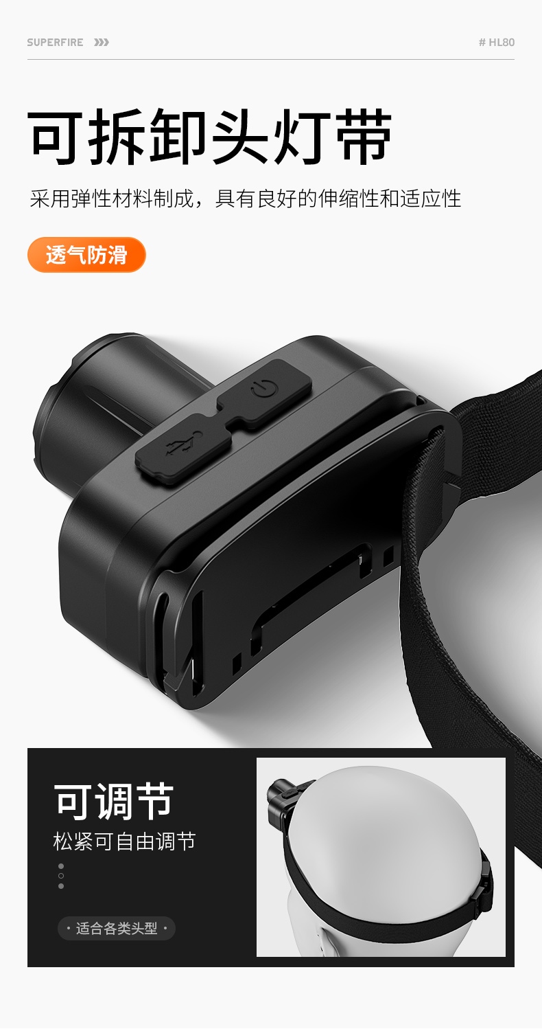 6.此款頭燈款式潮流、設(shè)計(jì)小巧、攜帶方便、頭帶材質(zhì)柔軟、可自由拆卸、便于清洗。