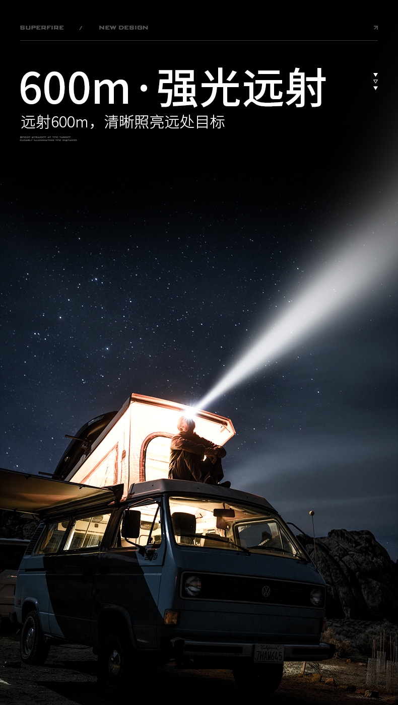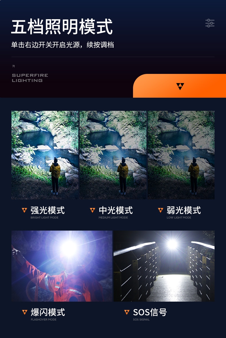 1、五檔一體:強(qiáng)中弱、爆閃、SOS自由切換,可滿足不同場(chǎng)景下的使用需求。