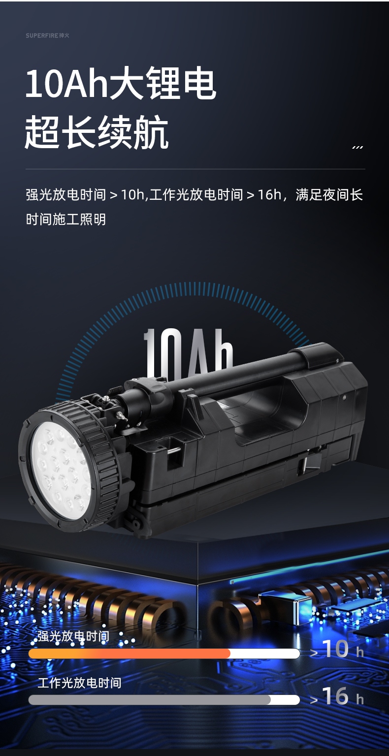 強光放電時間>10h,工作光放電時間>16h,滿足夜間長