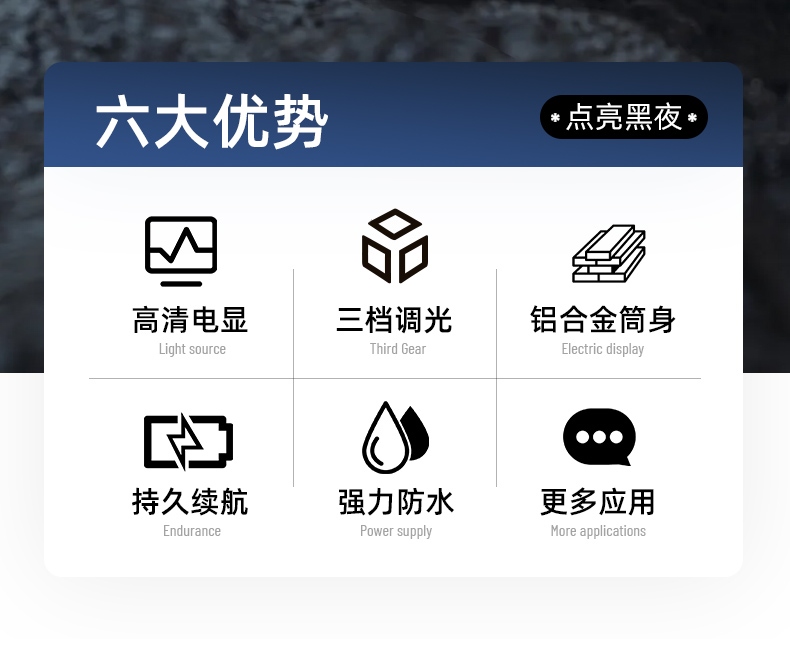 1、六檔調光,可滿足不同使用場景下的照明需求。 2、進口高亮朗明納斯燈珠,照明效果更好。 3、含檔位記憶,任意檔位快捷關機 ,開機恢復關機前檔位。