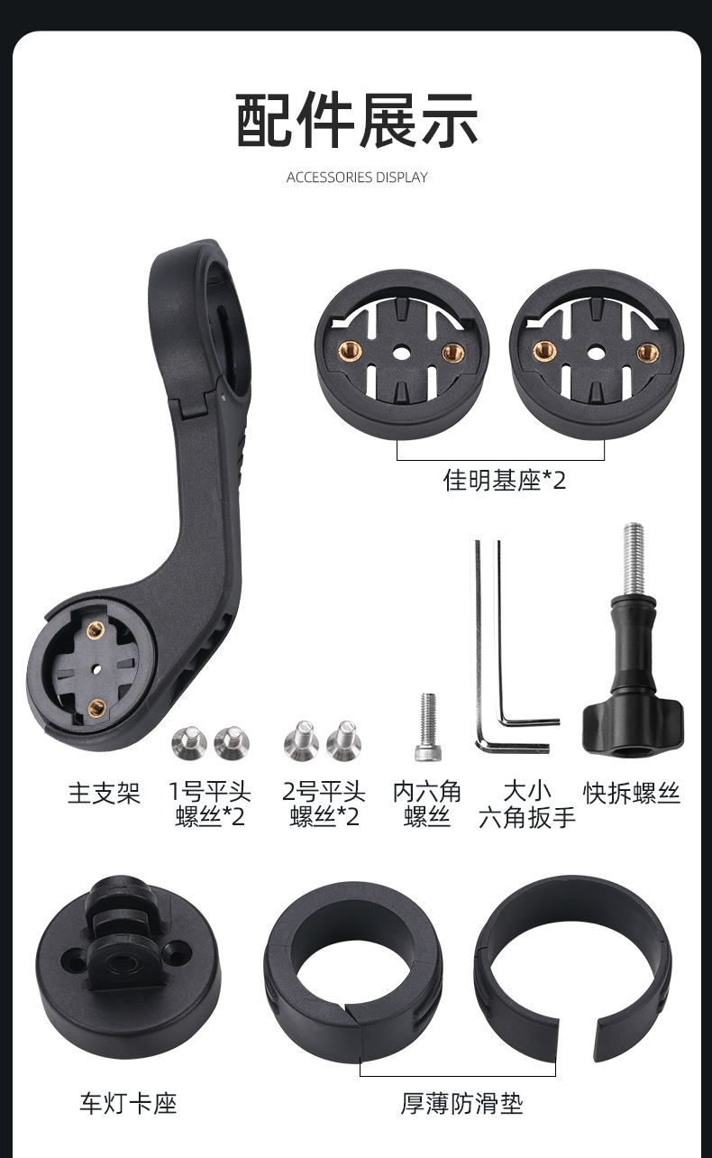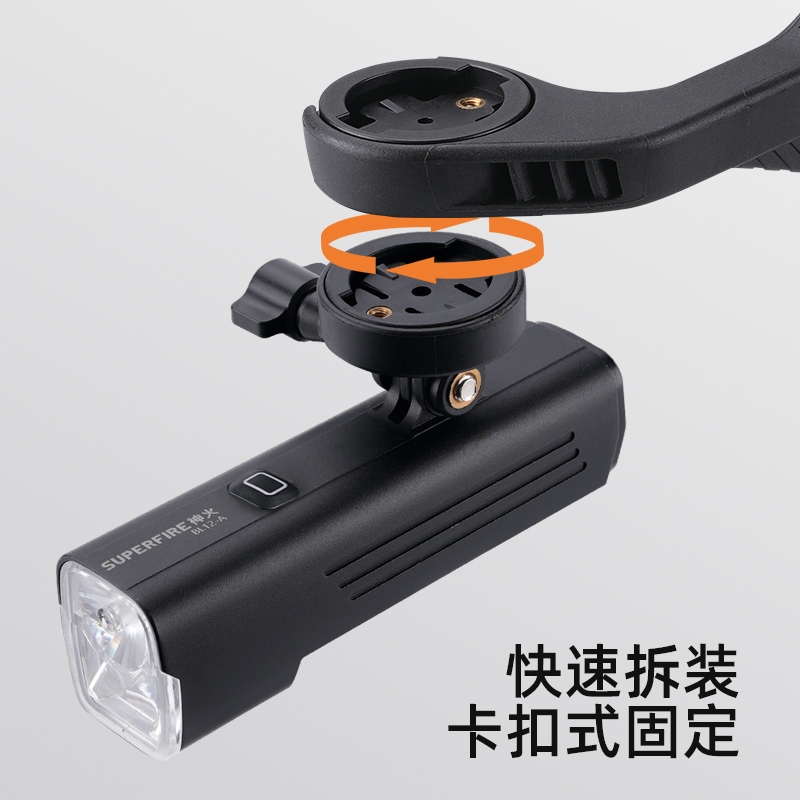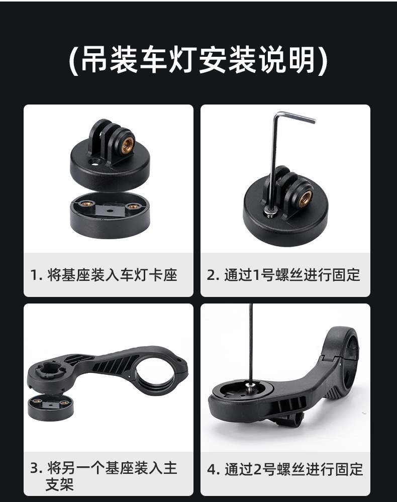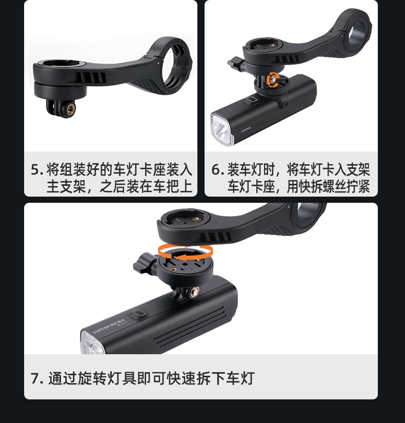 6.裝車(chē)燈時(shí),將車(chē)燈卡入支架車(chē)燈卡座,用快拆螺絲擰緊