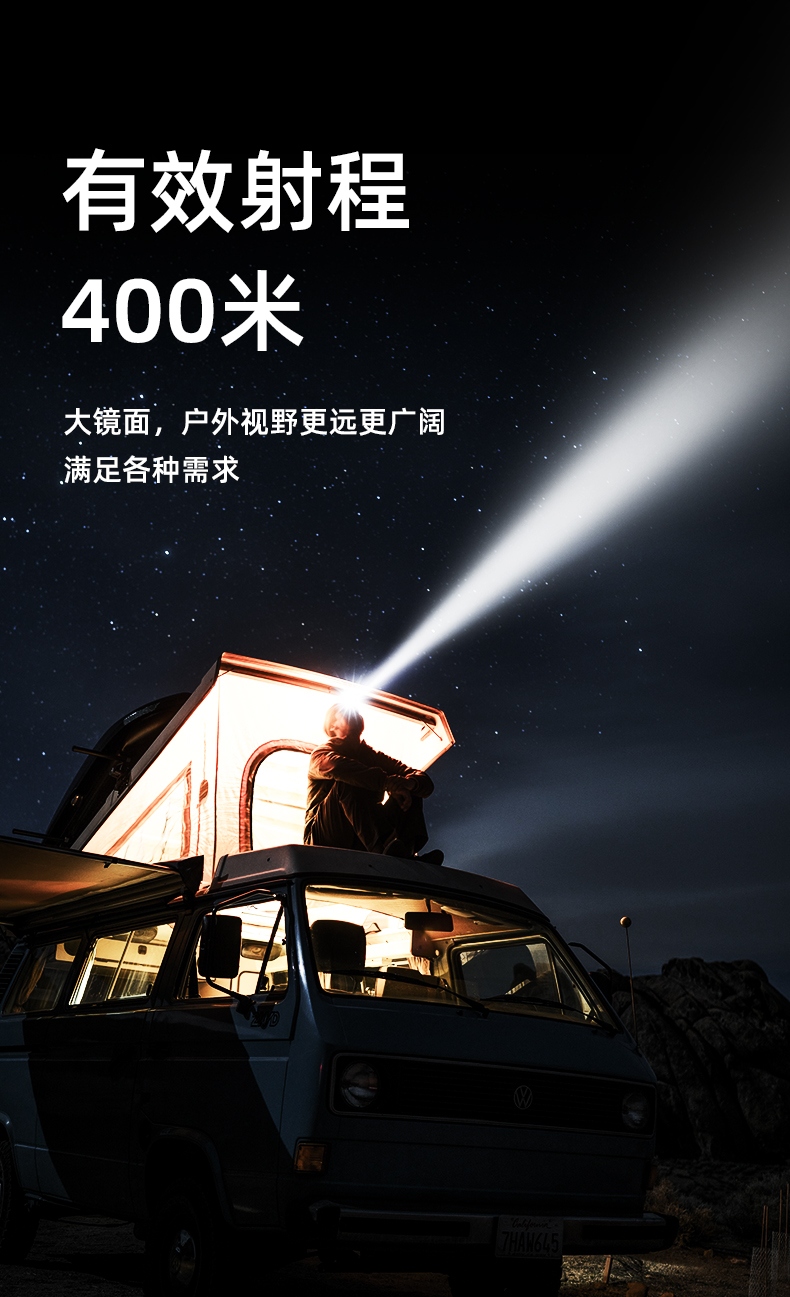 聚光主燈 亮度隨心 輕按后端開關按鈕,主燈強光點亮,續按依次切換主燈工作光-爆閃光。主燈開啟狀態下長按5秒,可實現光源色溫轉換。主燈關閉狀態下長按5秒,可開啟燈具最亮照明模式。 爆亮強光 亮如白晝 1500LM大功率高亮光源,點亮頃刻如白晝