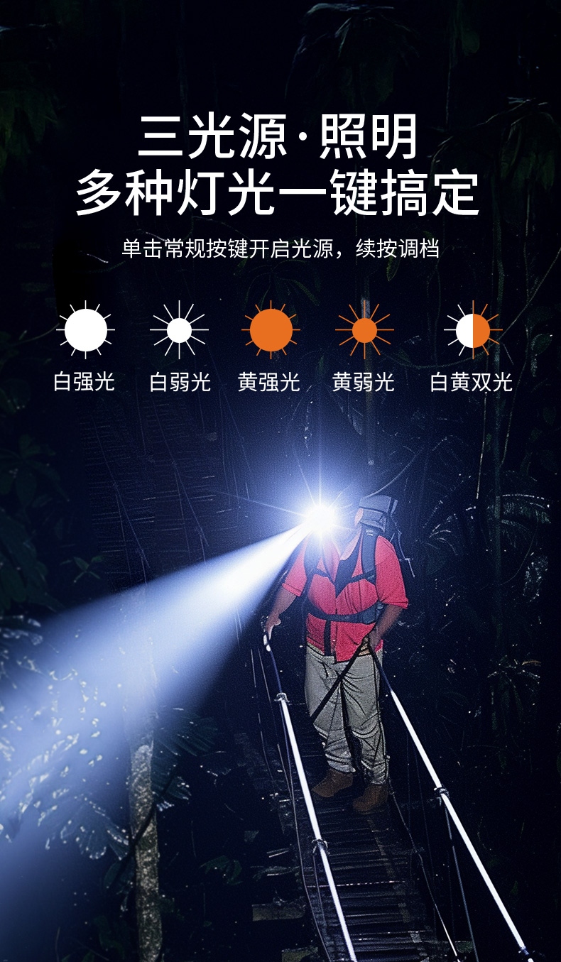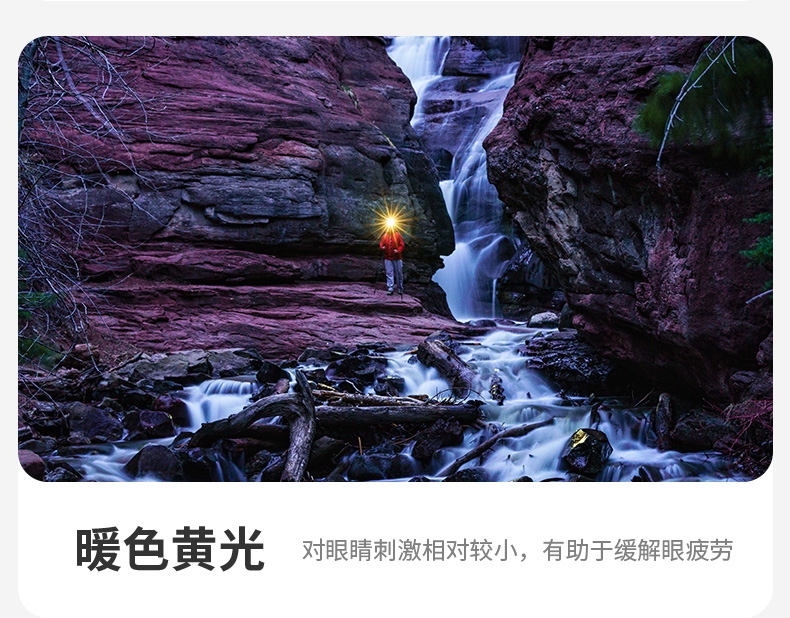 聚光主燈 亮度隨心 輕按后端開關按鈕,主燈強光點亮,續按依次切換主燈工作光-爆閃光。主燈開啟狀態下長按5秒,可實現光源色溫轉換。主燈關閉狀態下長按5秒,可開啟燈具最亮照明模式。 爆亮強光 亮如白晝 1500LM大功率高亮光源,點亮頃刻如白晝