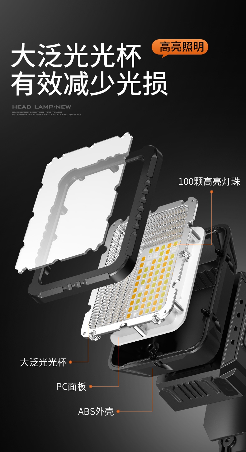 1、多檔調光,可滿足不同使用場景下的照明需求; 2、含提手,握感更舒適。攜帶更簡單; 3、新型高亮遠射燈珠,60W大功率,亮度高,照明效果好。