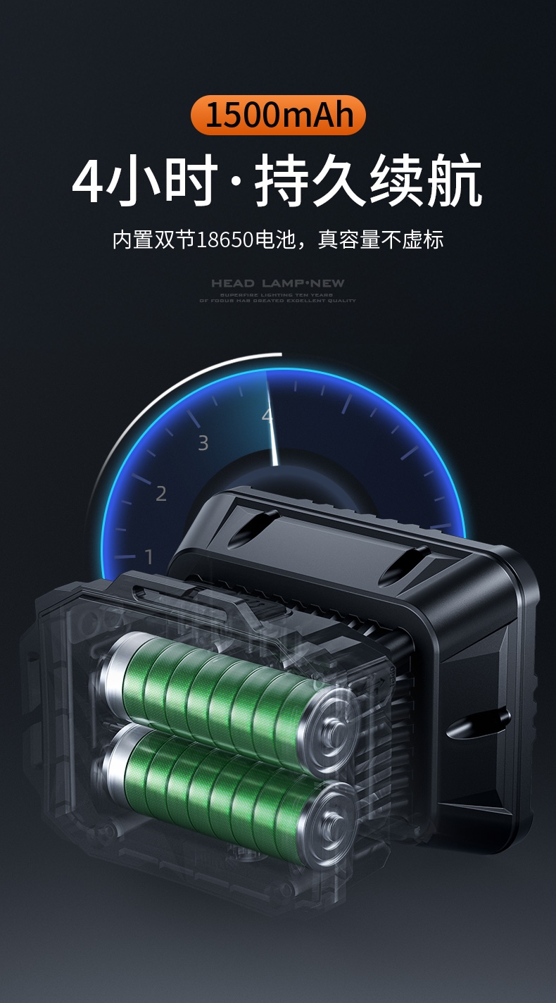 強光亮度,運動頭燈,前后均衡設計,輕便不壓頭,可調節式頭燈帶,佩戴方便舒適,伸縮調焦,光照范圍大,照射距離遠,頭燈角度調節,超90度角度隨意調節,適宜各種環境使用