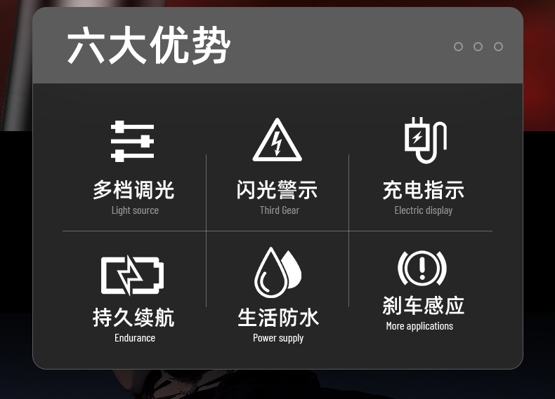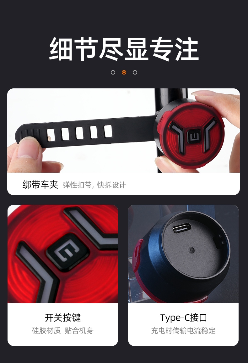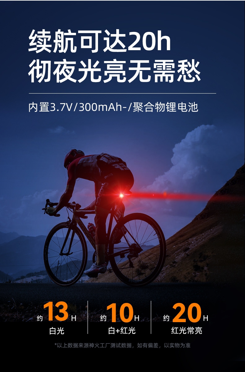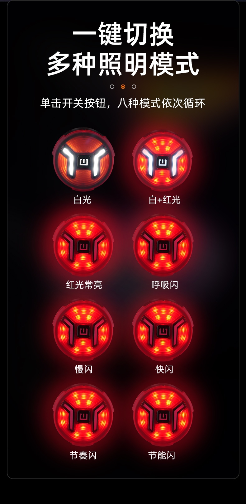 1、安全提醒,多模式閃爍警示,時常保你身后安全; 2、一鍵切換,多種照明模式,單擊開關按鈕,八種模式依次循環; 3、續航可達20h,徹夜光亮無需愁。