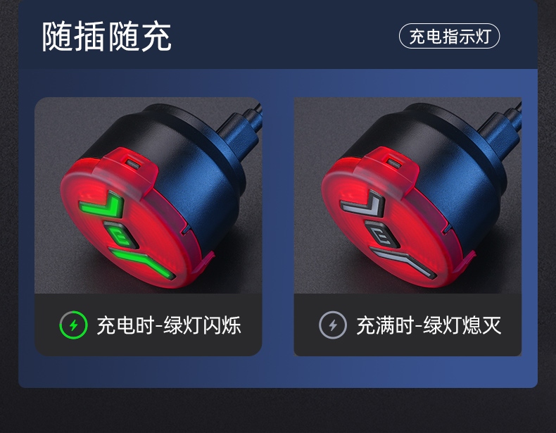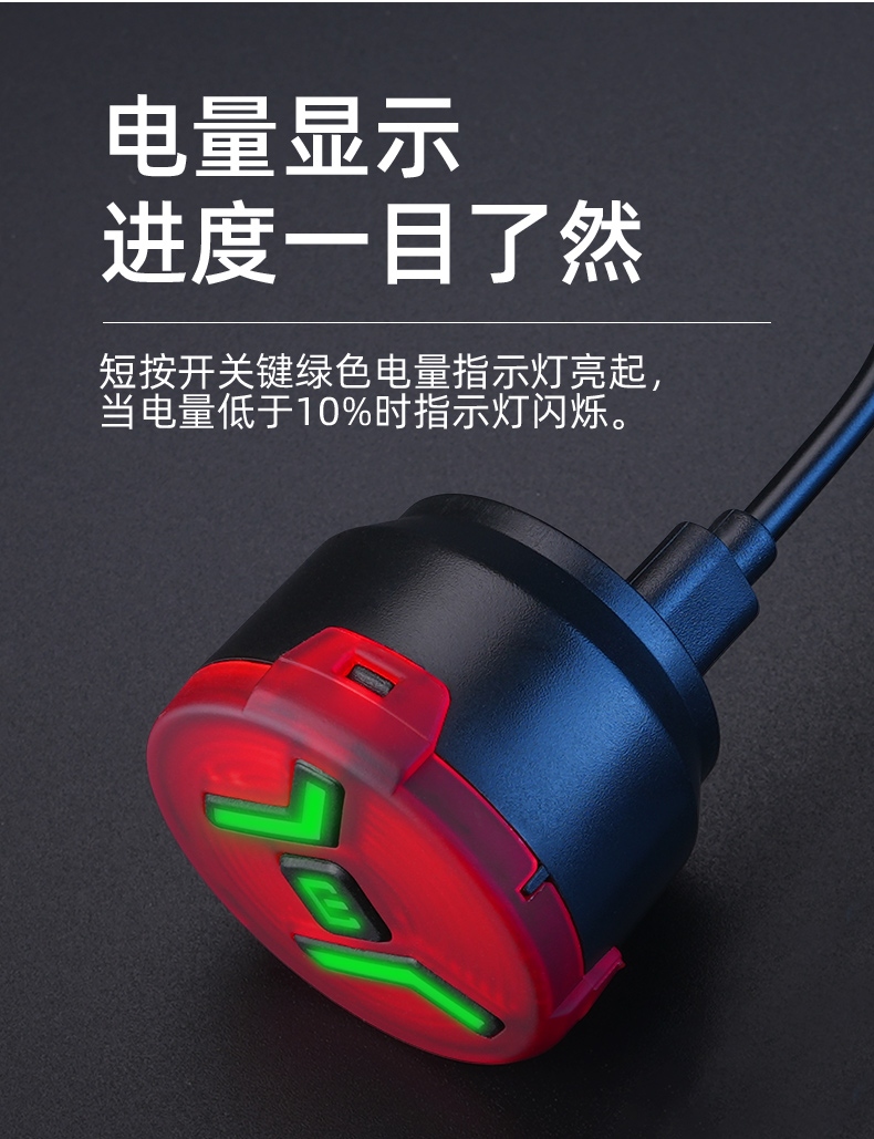 3、短按開關鍵綠色電量指示燈亮起,當電量在30%~10%時指示燈慢閃,在10%以下時指示燈快閃。充電時綠色指示燈閃爍,充滿燈滅。