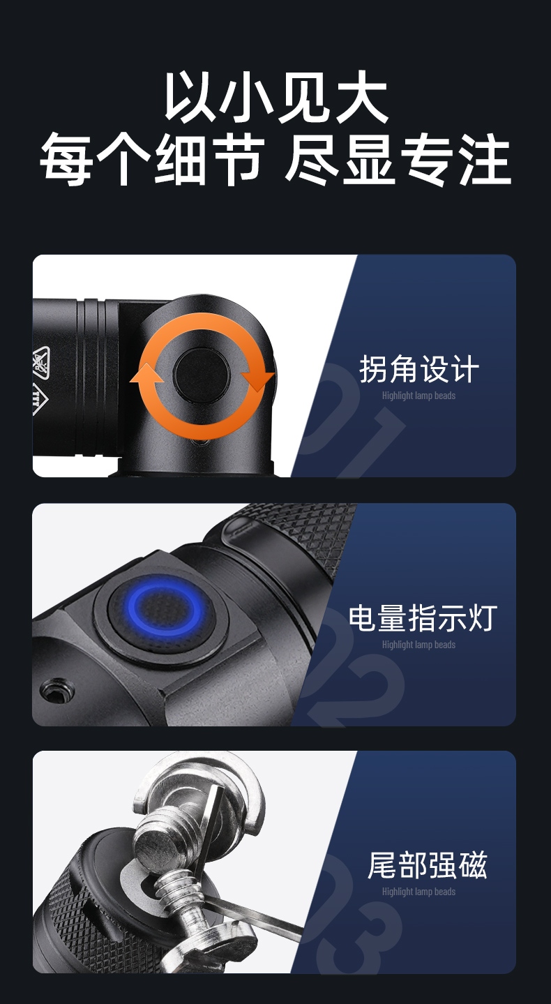 1.便捷腰夾攜帶更輕松,可別于胸前/腰間,取用更方便; 2.旋轉燈頭,可當手電,拐角工作燈燈頭可90°左右旋轉調節; 3.尾部磁吸,應用多種需求,一燈搞定。