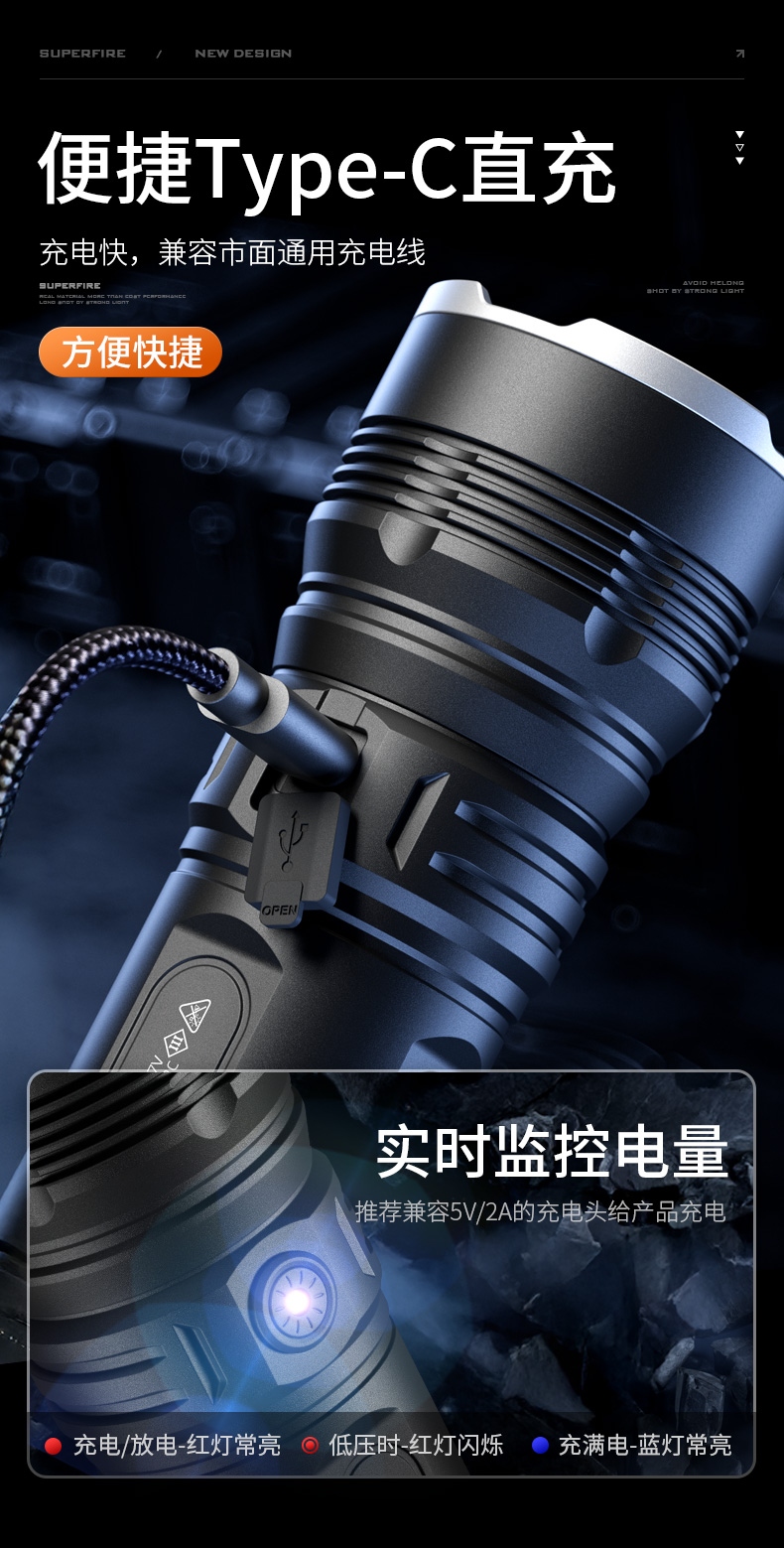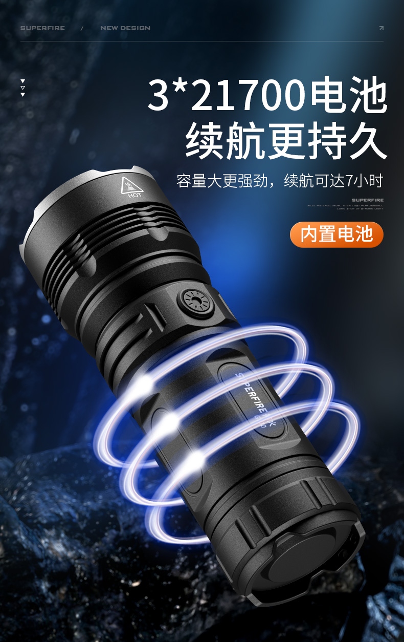 1、千米遠射,射程更遠,光斑更聚焦。 2、進口燈珠,亮度高,照明效果更好。 3、前后雙按鍵,光源一鍵點亮,高亮瞬間開啟。