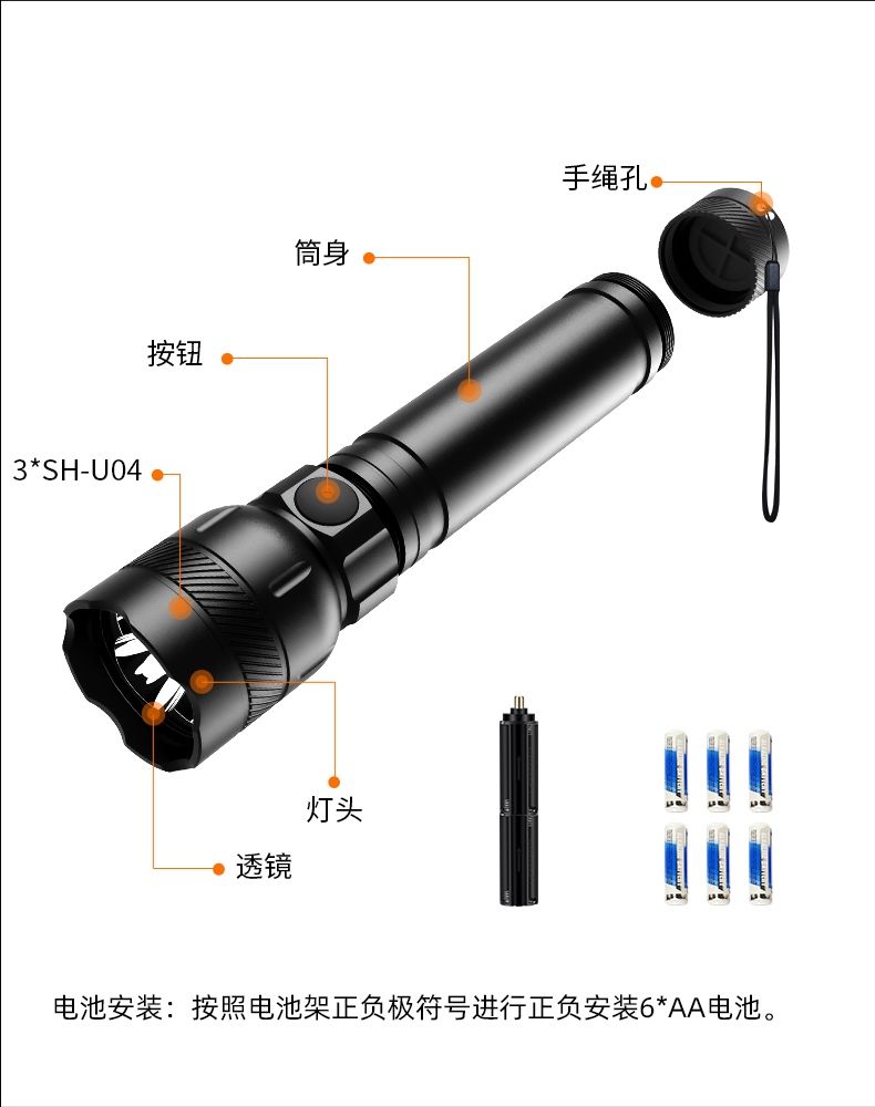四種照明模式,1000流明超亮手電,3顆SH-U04燈珠