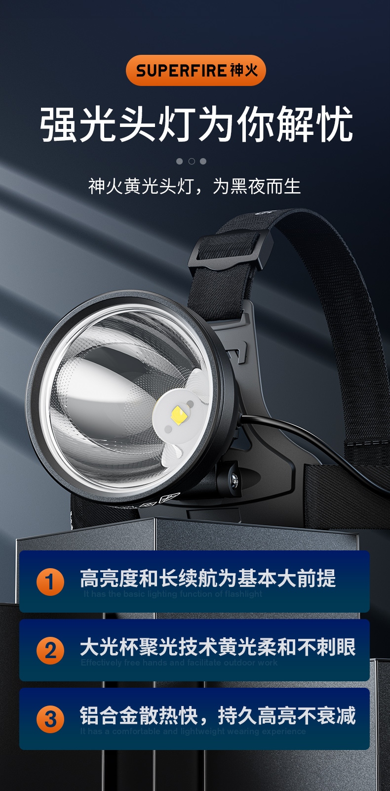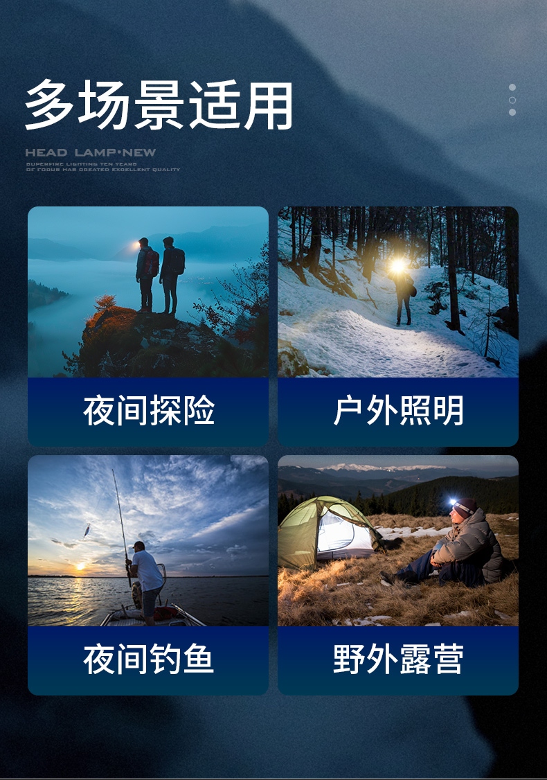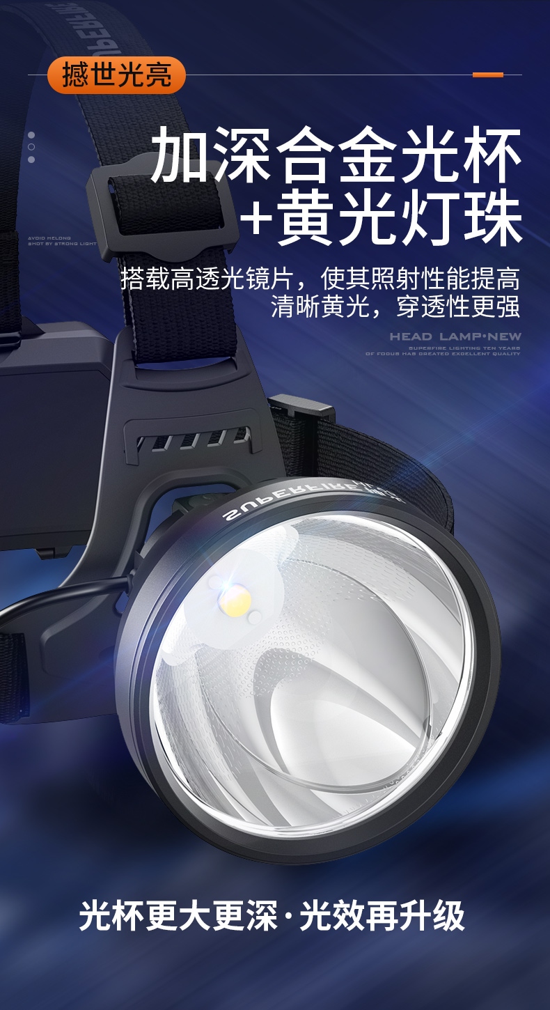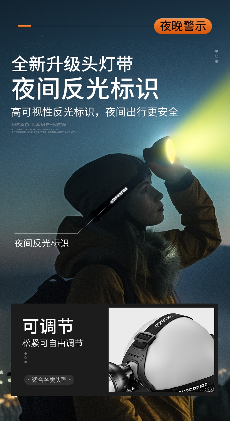 強(qiáng)光亮度,運(yùn)動(dòng)頭燈,前后均衡設(shè)計(jì),輕便不壓頭,可調(diào)節(jié)式頭燈帶,佩戴方便舒適,伸縮調(diào)焦,光照范圍大,照射距離遠(yuǎn),頭燈角度調(diào)節(jié),超90度角度隨意調(diào)節(jié),適宜各種環(huán)境使用