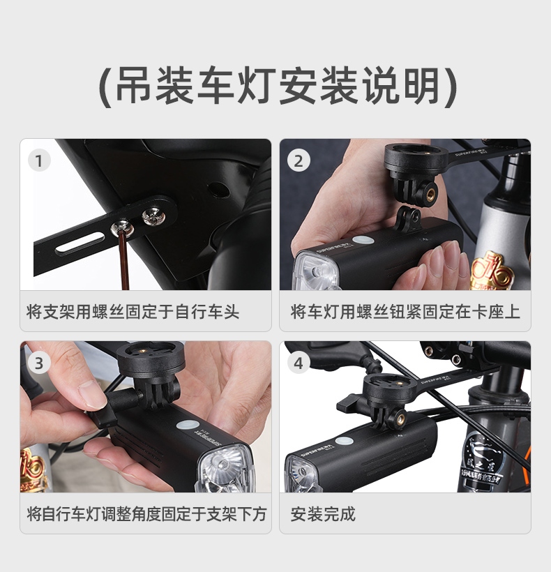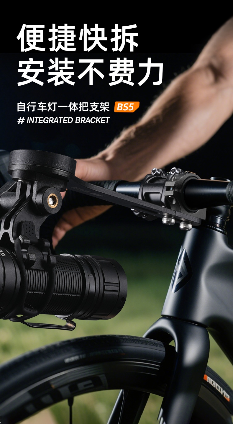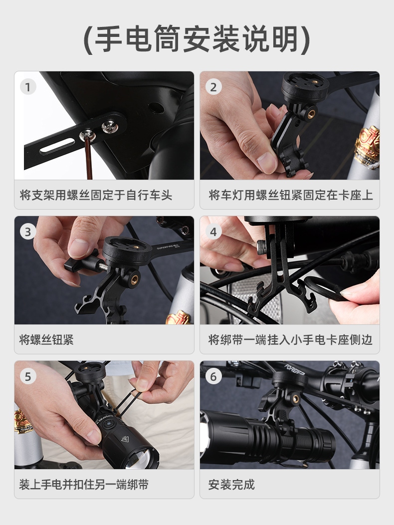 3、六角螺絲便捷鎖定,配置下掛接頭和手電夾,車燈類型隨心選擇;