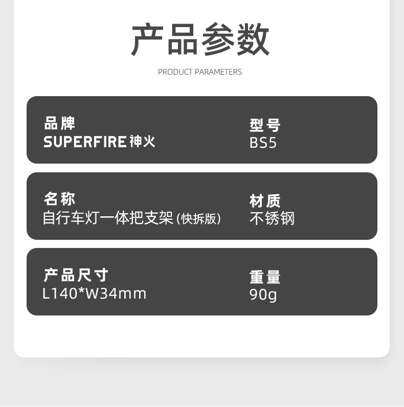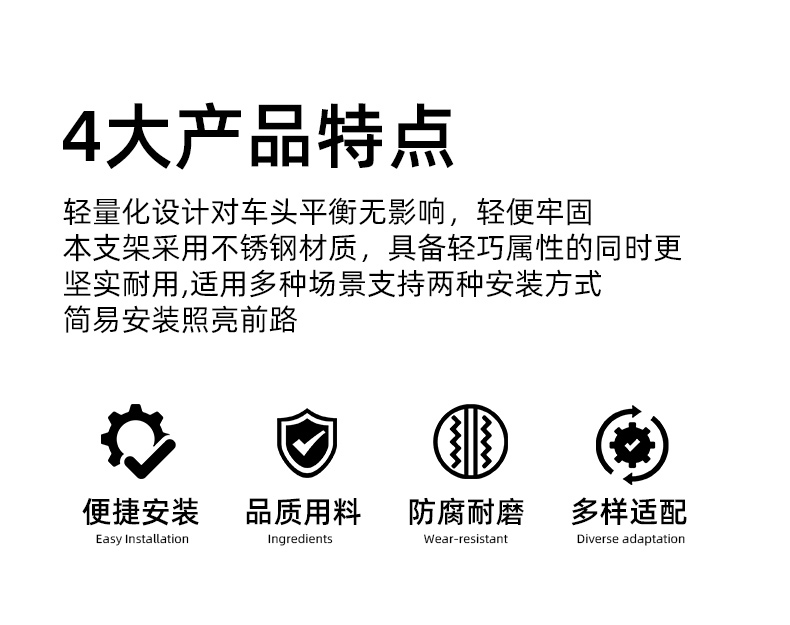 輕量化設計對車頭平衡無影響,輕便牢固;本支架采用不銹鋼材質,具備輕巧屬性的同時更 堅實耐用,適用多種場景支持兩種安裝方式;