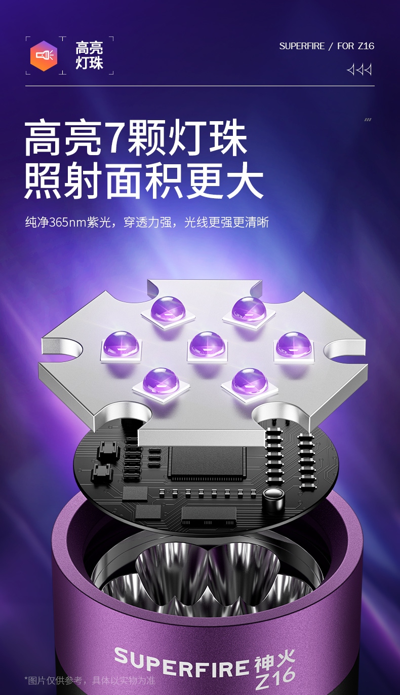 5、365nm紫光燈珠,波長短,穿透性更強。