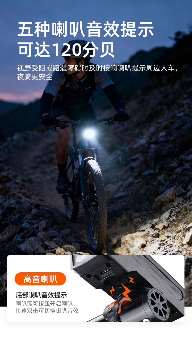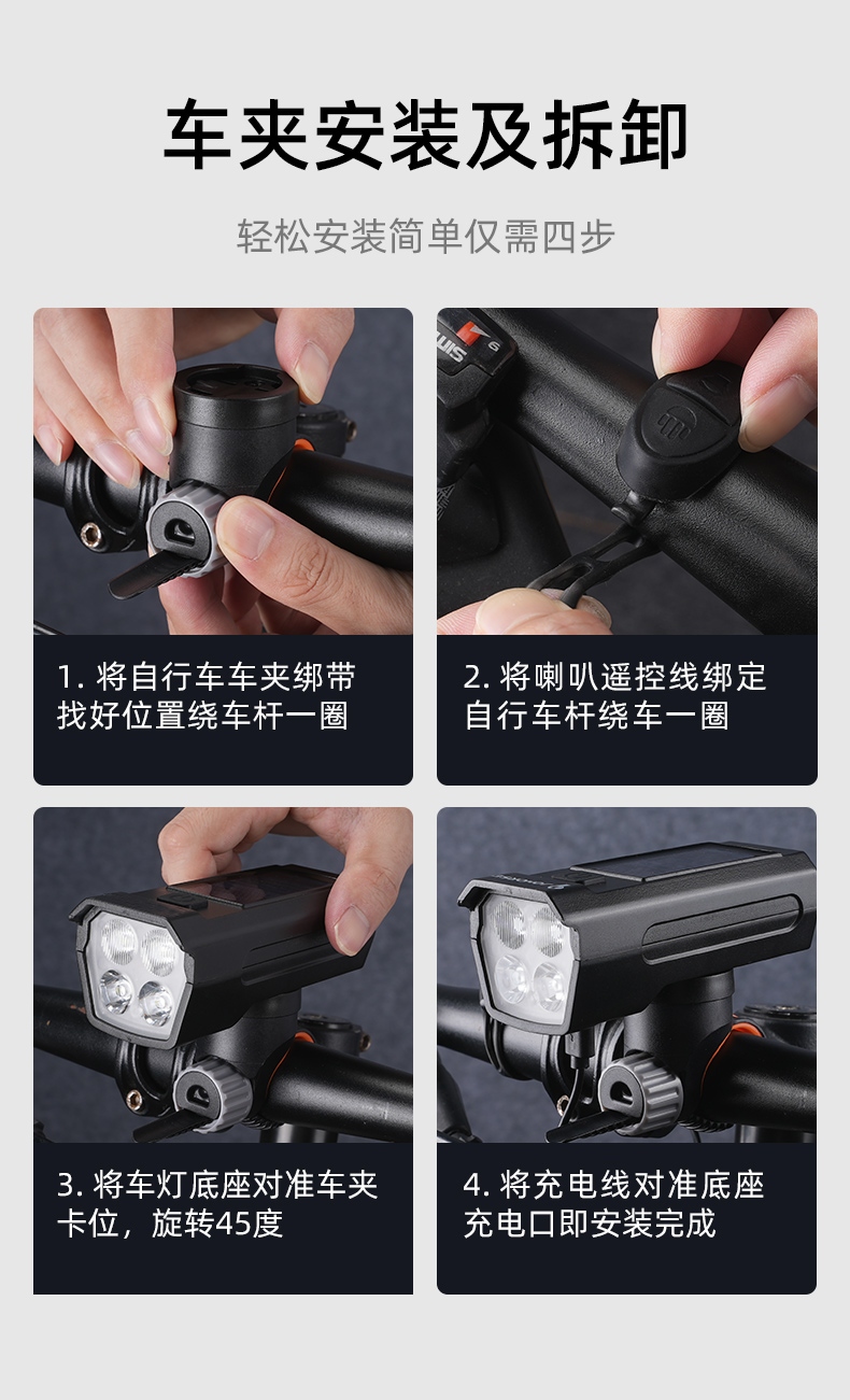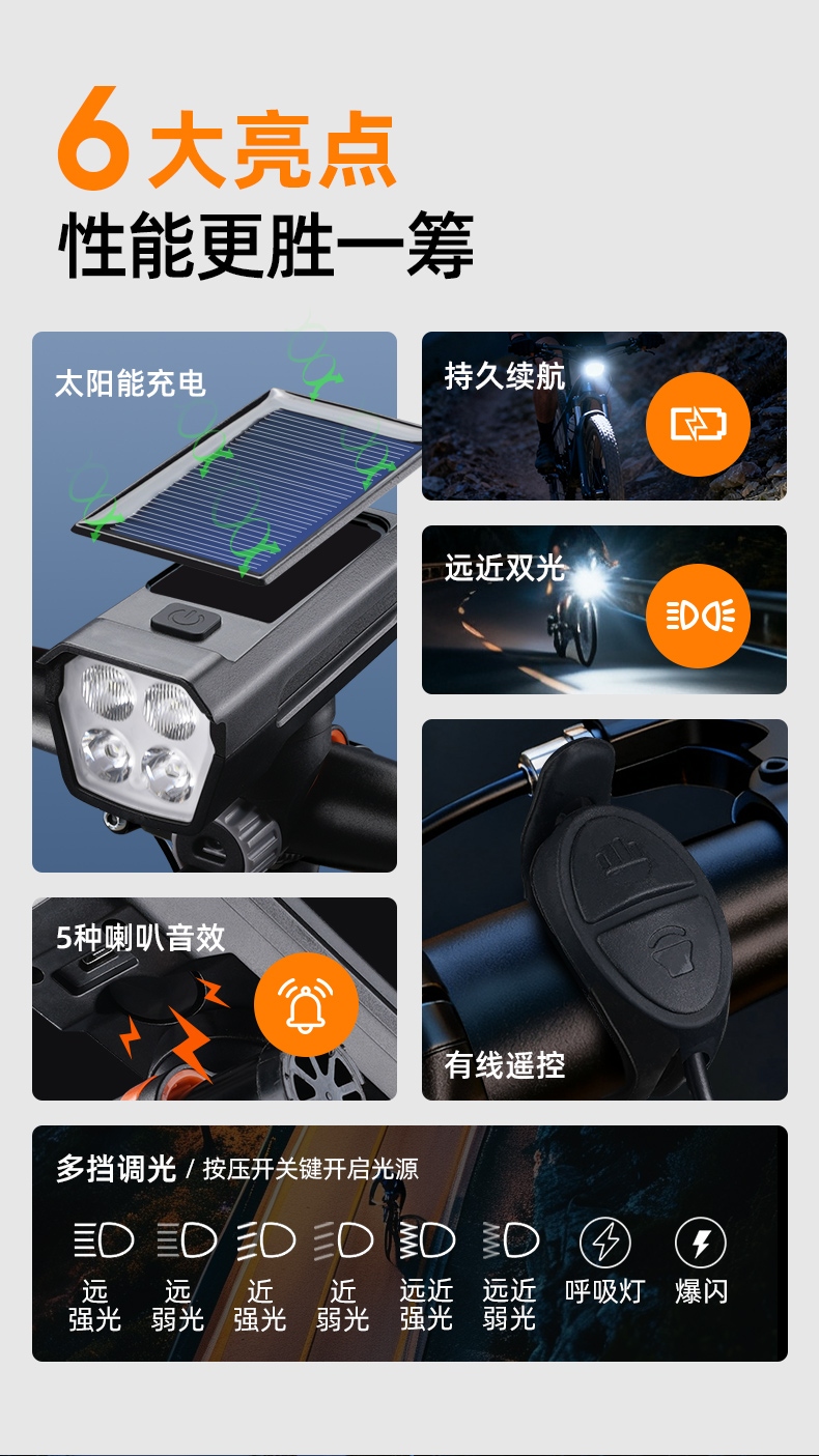 8擋燈光,5種喇叭音效(1米距離可達100分唄),太陽能充電,遠近雙光,有線遙控.