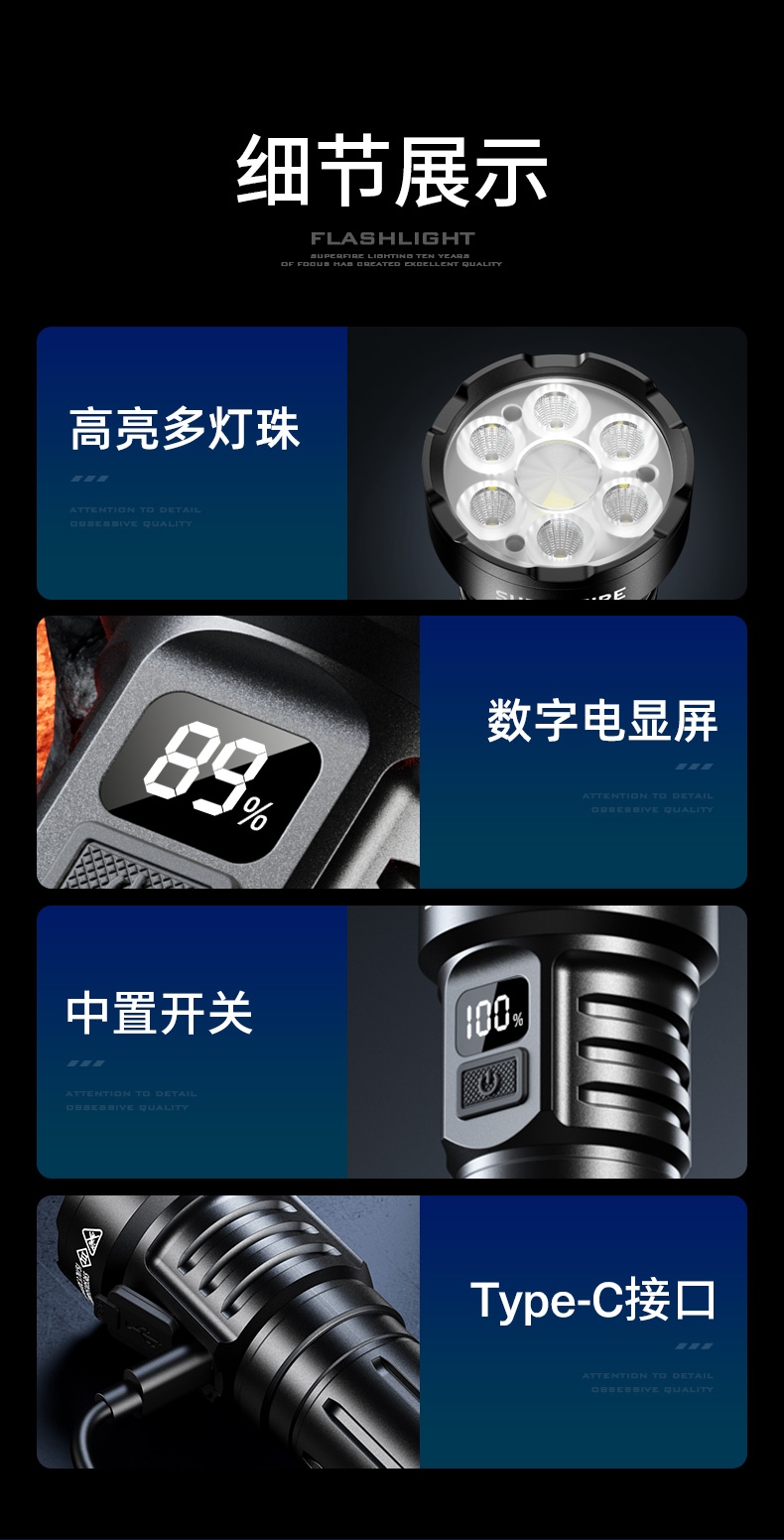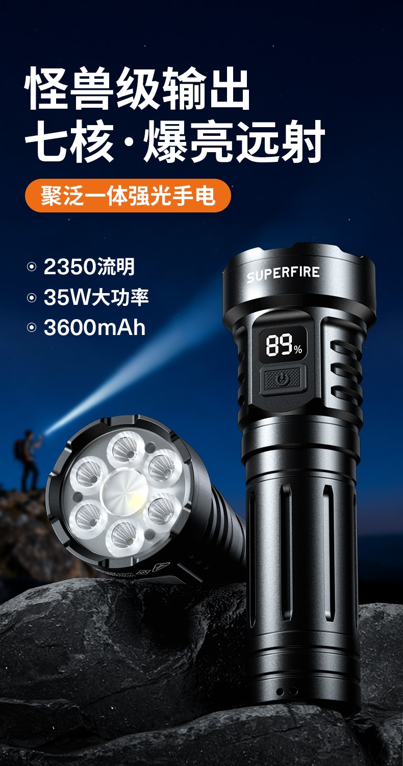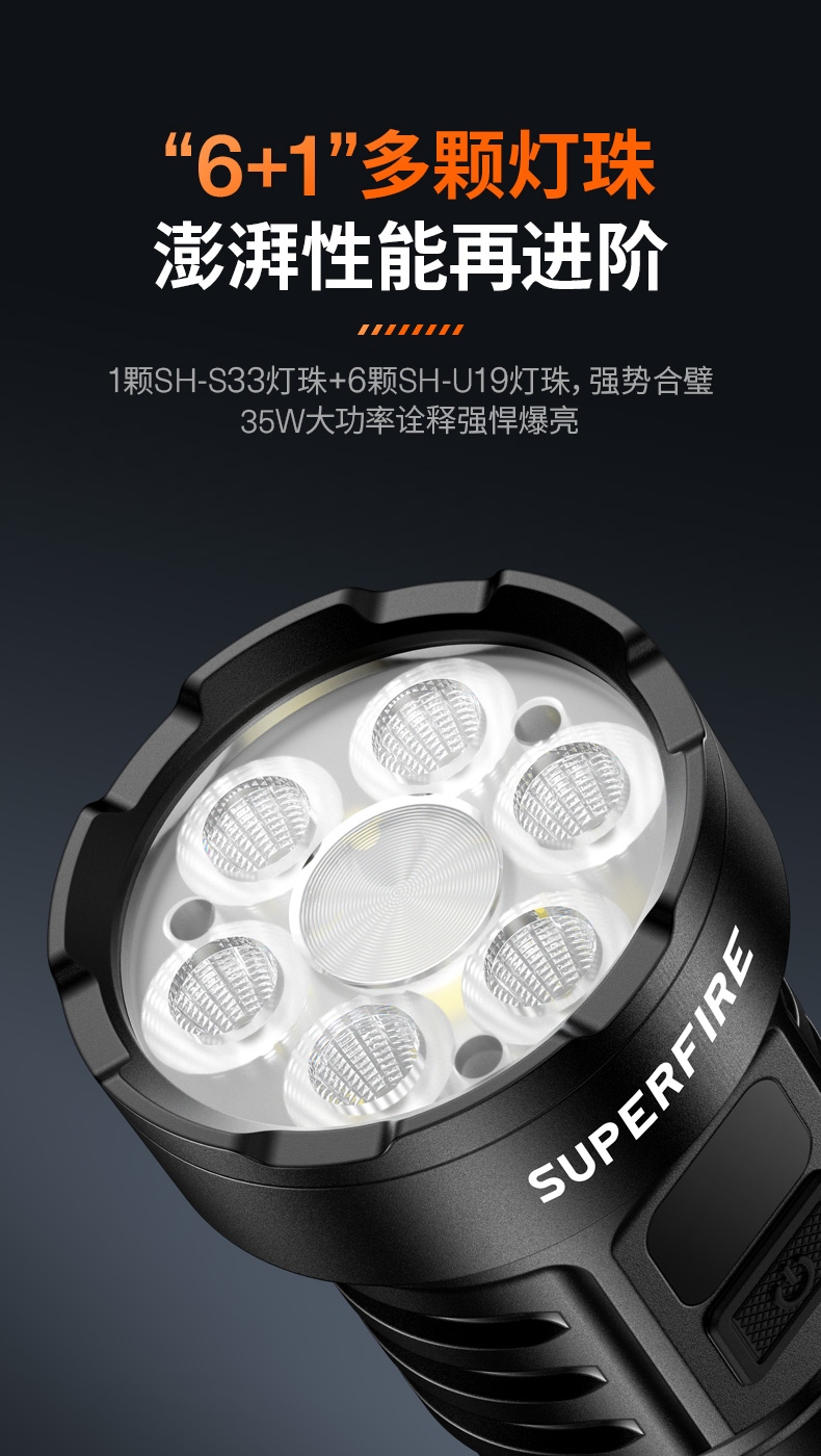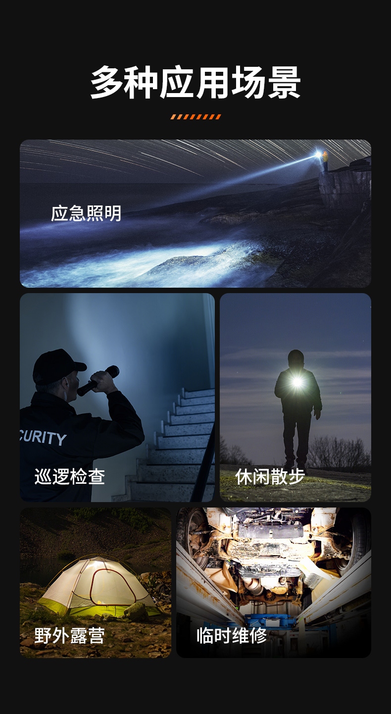 1、多顆高亮燈珠,亮度高,照明效果更好。 2、多種安全程序,可有效保護手電使用安全,延長手電使用壽命。 3、聚泛一體,遠近兼容。