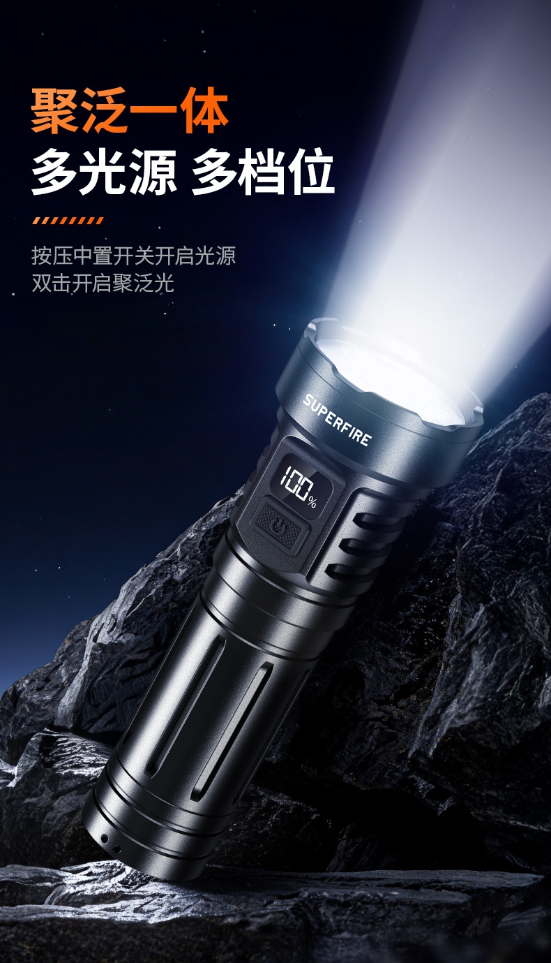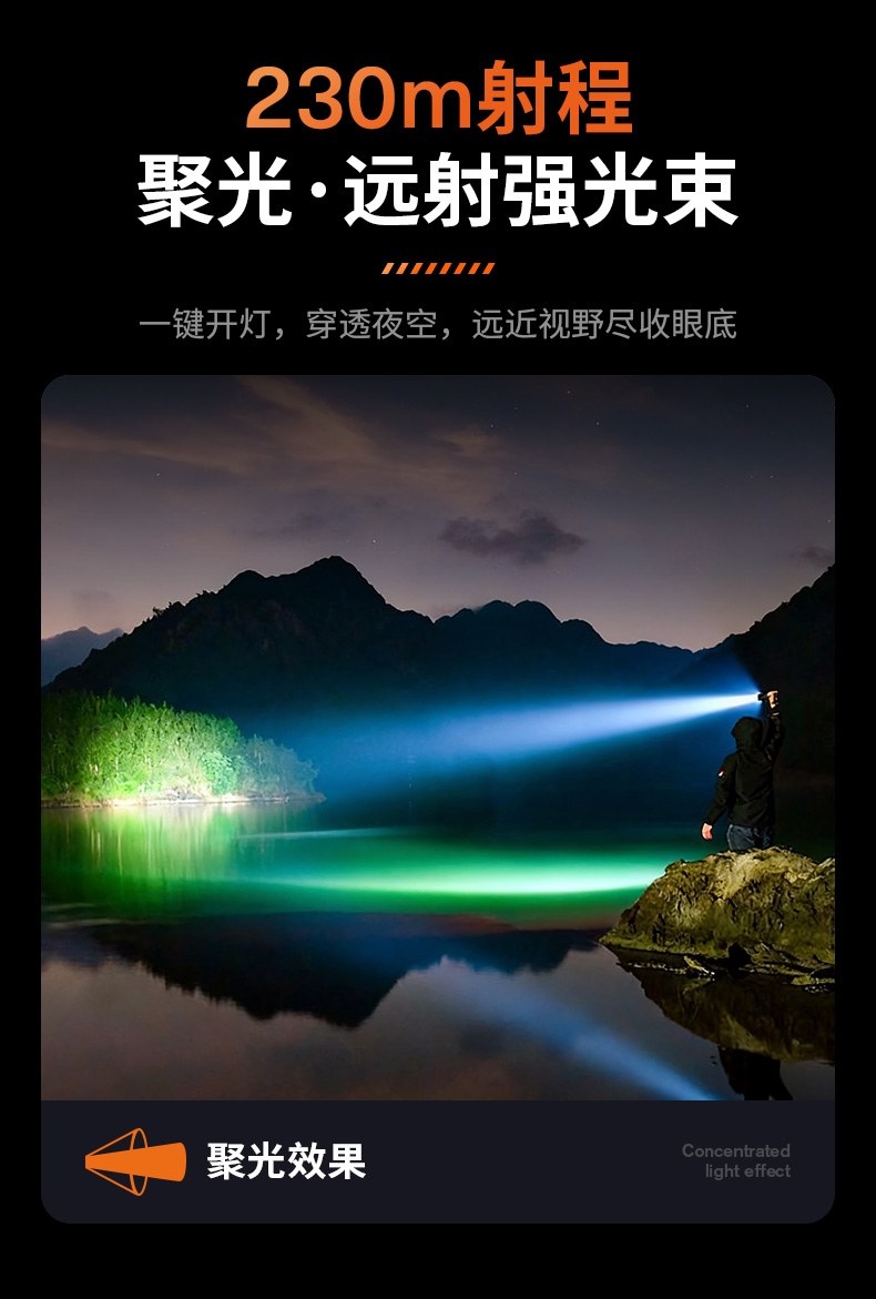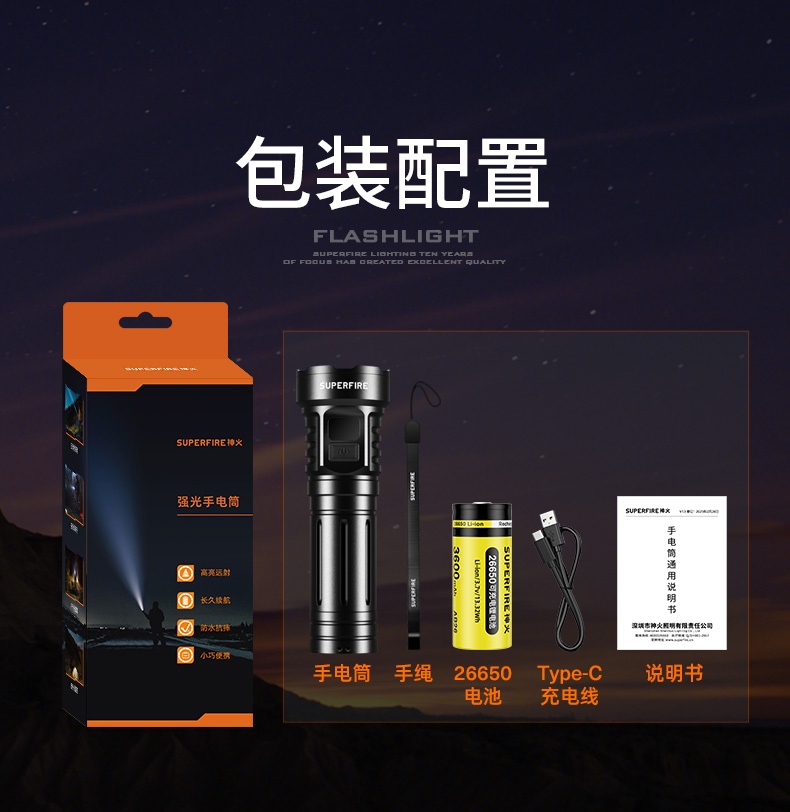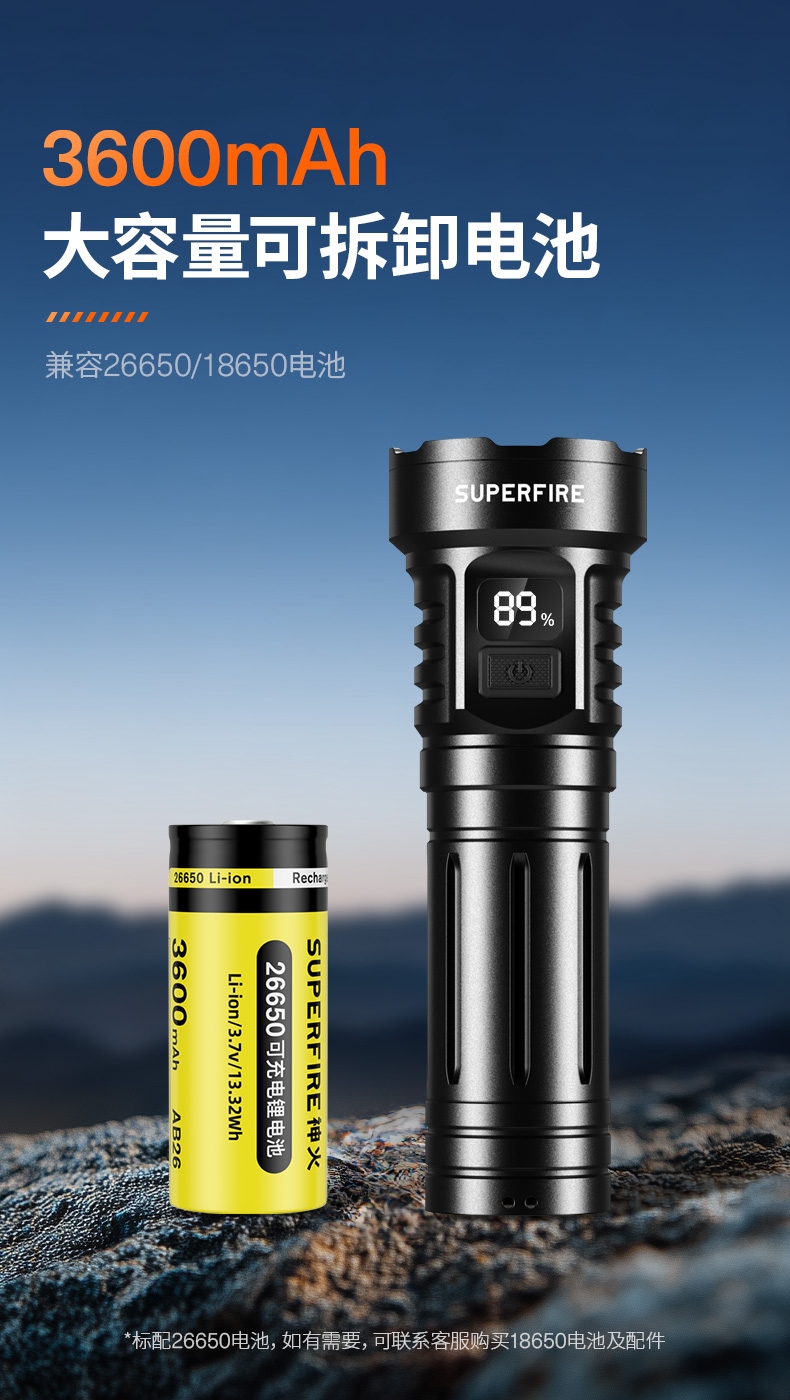 9、標配26650電池,容量大,照明更持久。