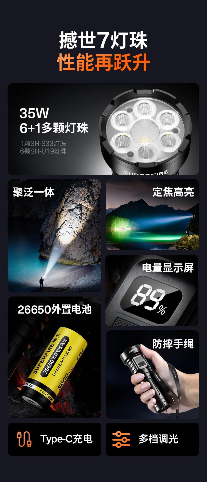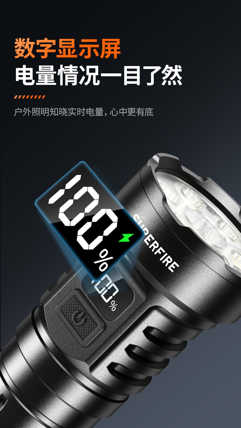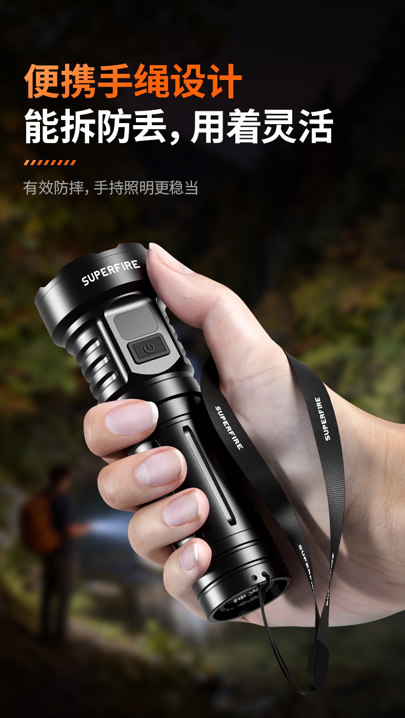 9、標配26650電池,容量大,照明更持久。