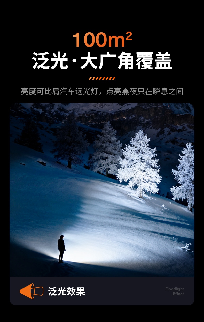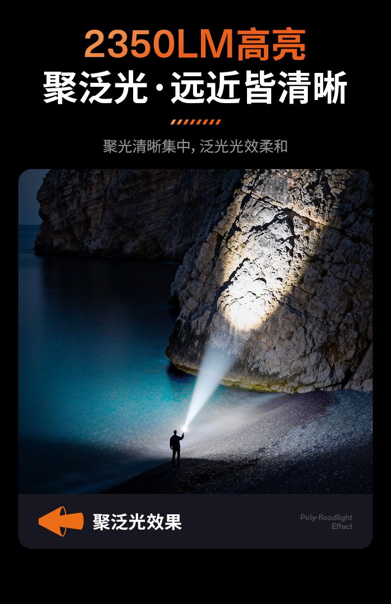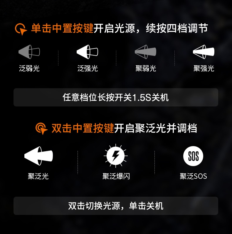 聚光主燈 亮度隨心 輕按后端開關按鈕,主燈強光點亮,續按依次切換主燈工作光-爆閃光。主燈開啟狀態下長按5秒,可實現光源色溫轉換。主燈關閉狀態下長按5秒,可開啟燈具最亮照明模式。 爆亮強光 亮如白晝 1500LM大功率高亮光源,點亮頃刻如白晝