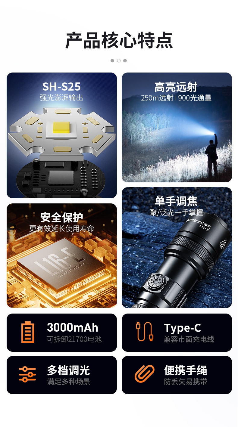 7、最高900Lm亮度,最遠(yuǎn)250m 射程,小身材大能量。
