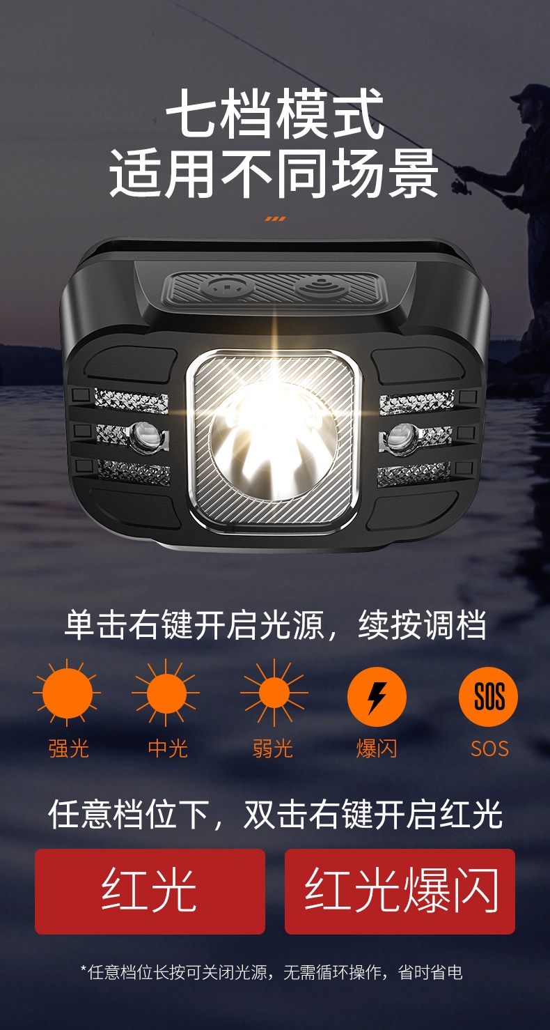1、單擊左邊開關開啟感應功能,續按關閉感應功能,當感應功能開啟時,單擊右邊開關可正常調節檔位。 2、充電時紅色指示燈常亮,充滿時藍色指示燈常亮。 3、此款頭燈款式潮流、設計小巧、攜帶方便、頭帶材質柔軟、可自由拆卸、便于清洗。