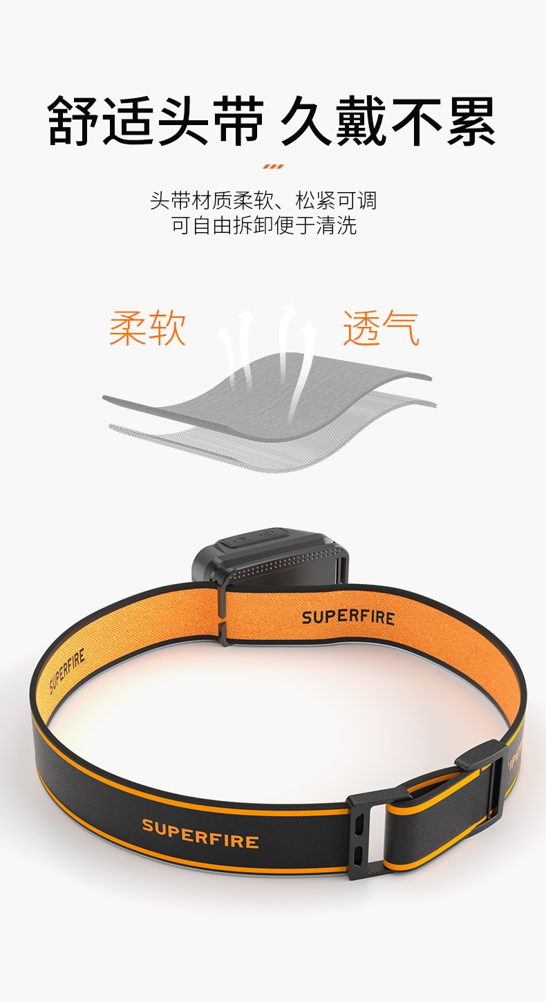 5、此款頭燈款式潮流、設計小巧、攜帶方便、頭帶材質柔軟、可自由拆卸、便于清洗。