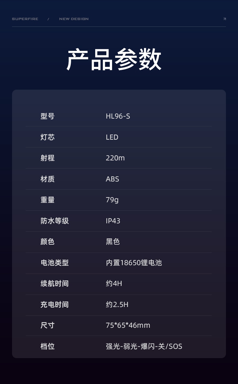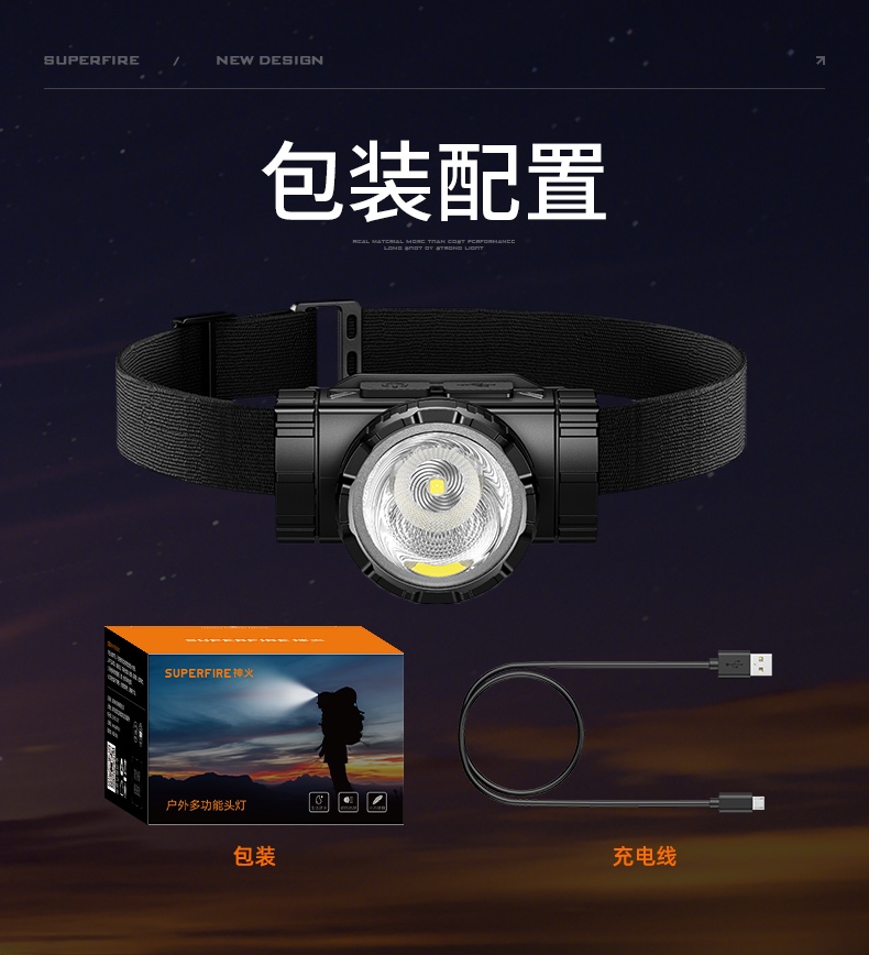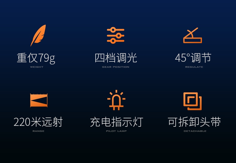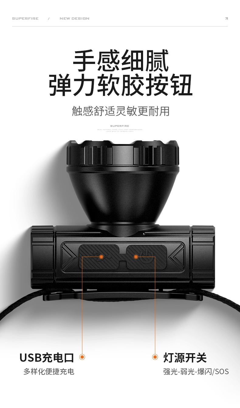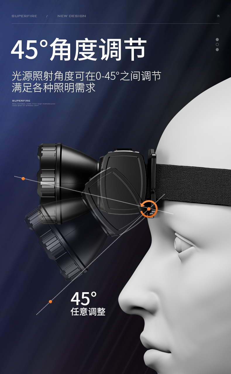 強光亮度,運動頭燈,前后均衡設計,輕便不壓頭,可調節式頭燈帶,佩戴方便舒適,伸縮調焦,光照范圍大,照射距離遠,頭燈角度調節,超90度角度隨意調節,適宜各種環境使用