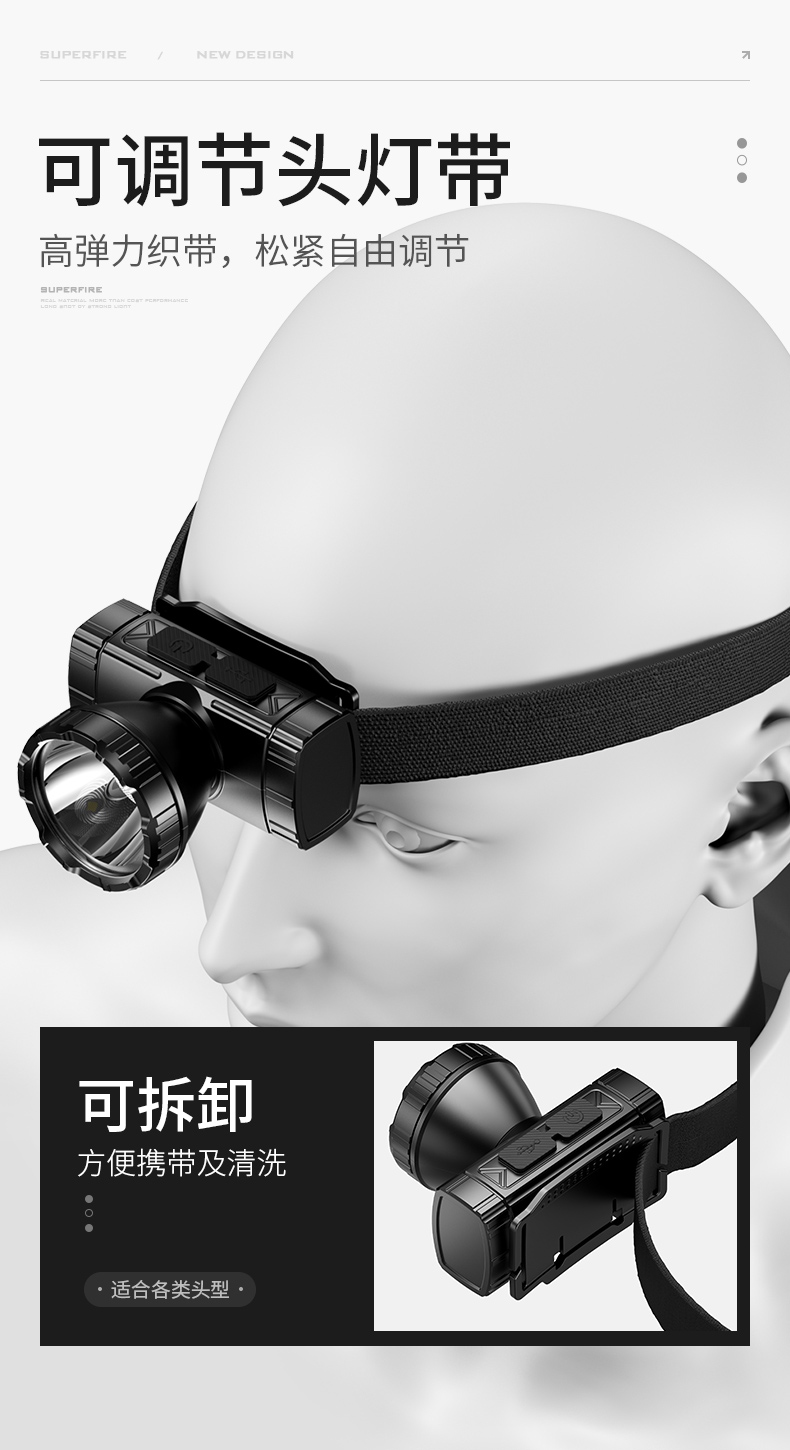 4、此款頭燈款式潮流、設計小巧、攜帶方便、頭帶材質柔軟、可自由拆卸、便于清洗。