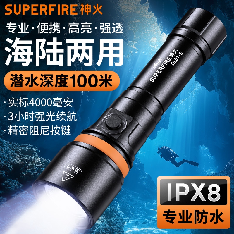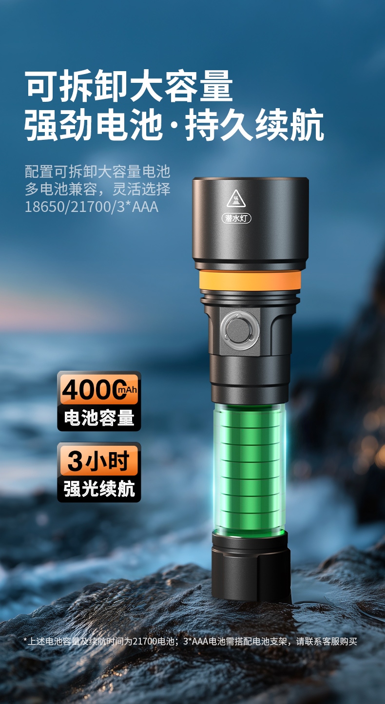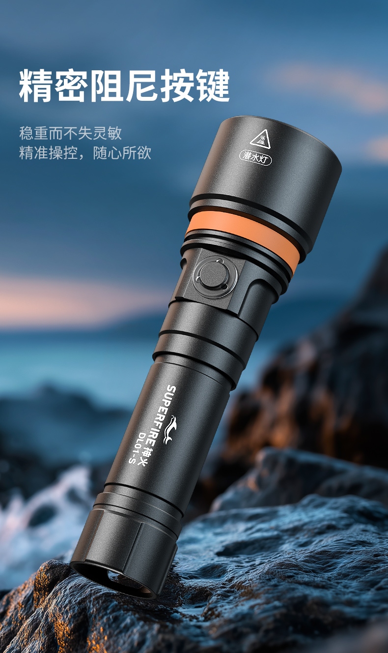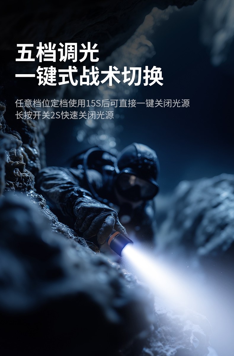 便攜開關操作:按鈕式設計,即使穿戴潛水手套也能輕松操作,同時具備多種光照模式切換功能。