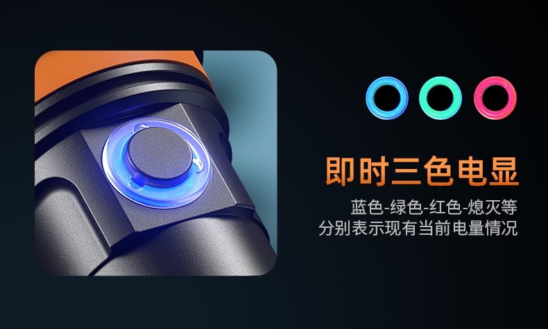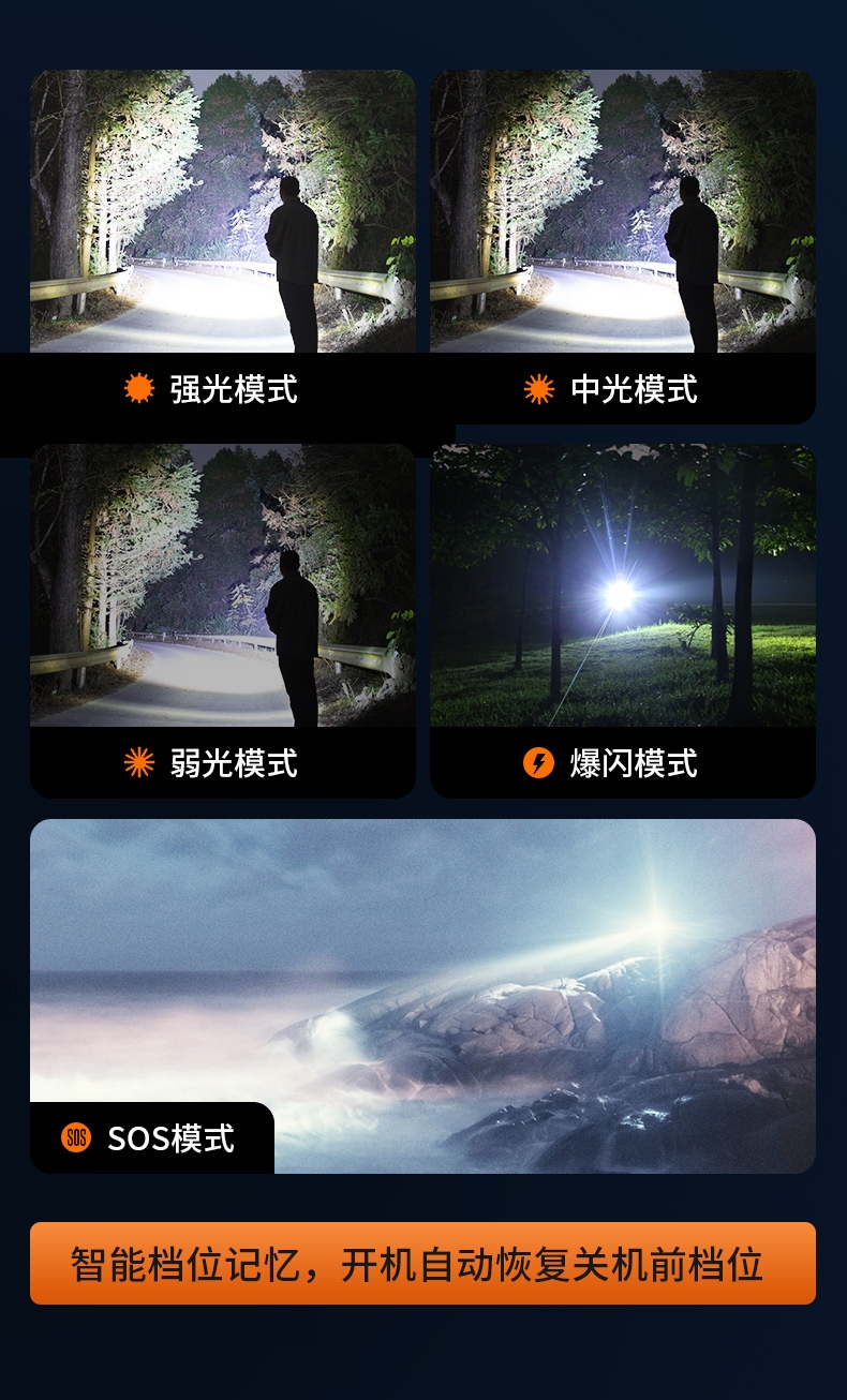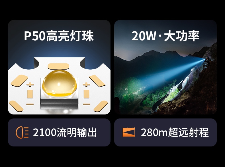 聚光主燈 亮度隨心 輕按后端開關按鈕,主燈強光點亮,續按依次切換主燈工作光-爆閃光。主燈開啟狀態下長按5秒,可實現光源色溫轉換。主燈關閉狀態下長按5秒,可開啟燈具最亮照明模式。 爆亮強光 亮如白晝 1500LM大功率高亮光源,點亮頃刻如白晝
