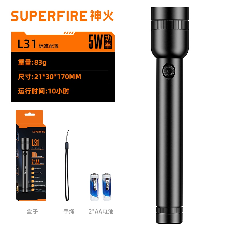 1、多檔調(diào)光,滿足不同使用環(huán)境下的照明需求。 2、配AA干電池,可隨時替換,續(xù)航更長久。 3、鋁合金筒身,防摔抗擊。