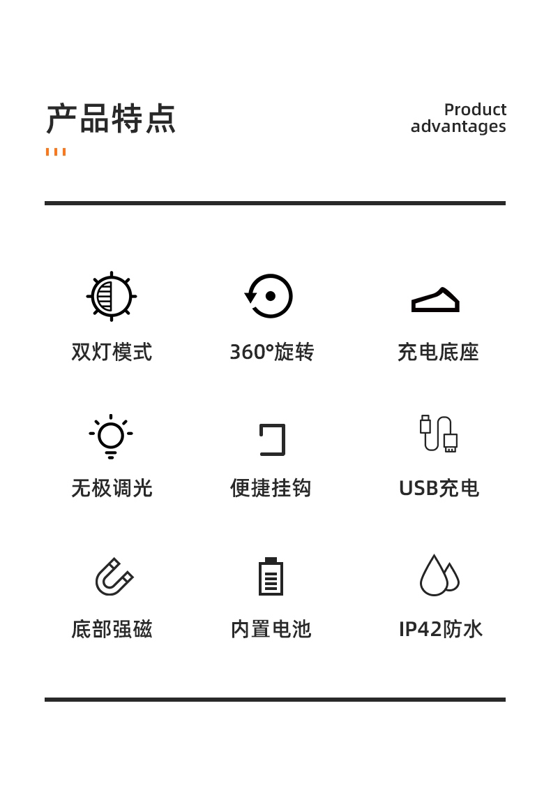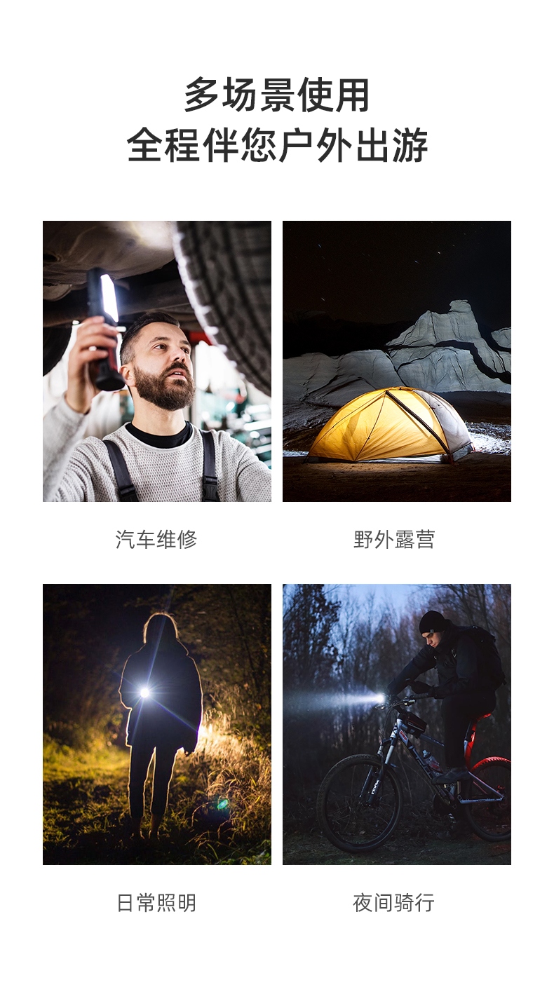 1、多檔調光,可滿足不同使用場景下的照明需求; 2、含提手,握感更舒適。攜帶更簡單; 3、新型高亮遠射燈珠,60W大功率,亮度高,照明效果好。
