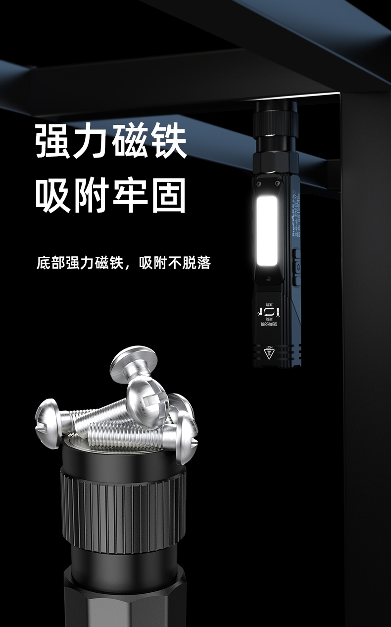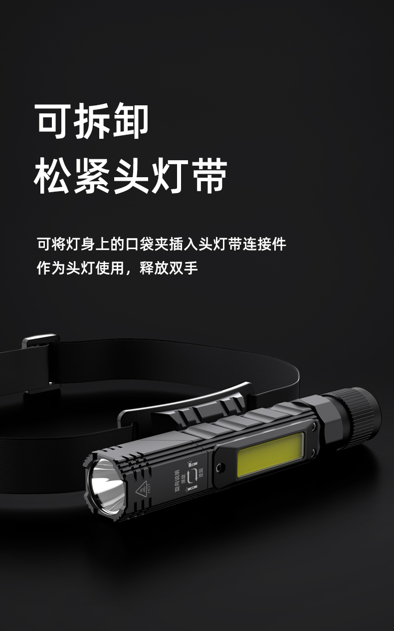 聚光主燈 亮度隨心 輕按后端開關按鈕,主燈強光點亮,續按依次切換主燈工作光-爆閃光。主燈開啟狀態下長按5秒,可實現光源色溫轉換。主燈關閉狀態下長按5秒,可開啟燈具最亮照明模式。 爆亮強光 亮如白晝 1500LM大功率高亮光源,點亮頃刻如白晝