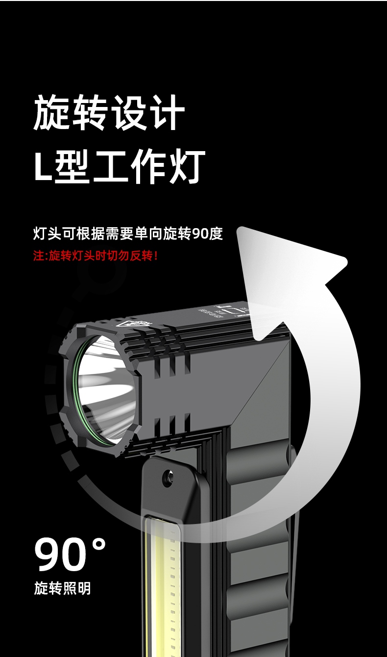 多功能旋轉手電(2種光源:白/紅光)頭部90度旋轉、可當頭燈、帶側燈、腰夾,底部磁鐵可根據不同場景調整照射方向。適用多種場景日常戶外、工作檢修、家庭應急等