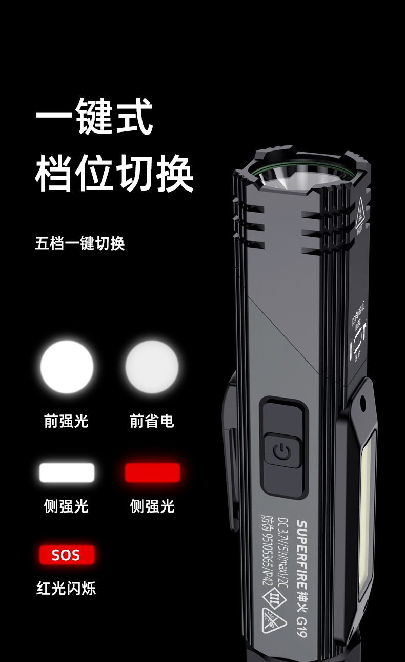 1.單擊左邊開關開啟感應功能,同時開啟強光檔,續按關閉感應功能(關閉感應功能,光源不會關閉),當感應功能開啟時,單擊右邊開關可正常調節檔位。 2.多樣化充電,使用方便:設有Type-c充電口,可使用充電器、充電寶、電腦等設備為燈具充電。 3.電量顯示:實時