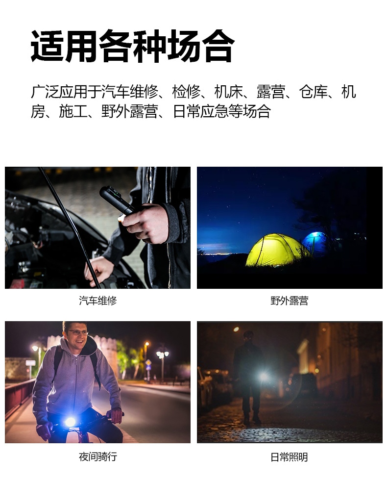 1、多檔調光,可滿足不同使用場景下的照明需求; 2、含提手,握感更舒適。攜帶更簡單; 3、新型高亮遠射燈珠,60W大功率,亮度高,照明效果好。