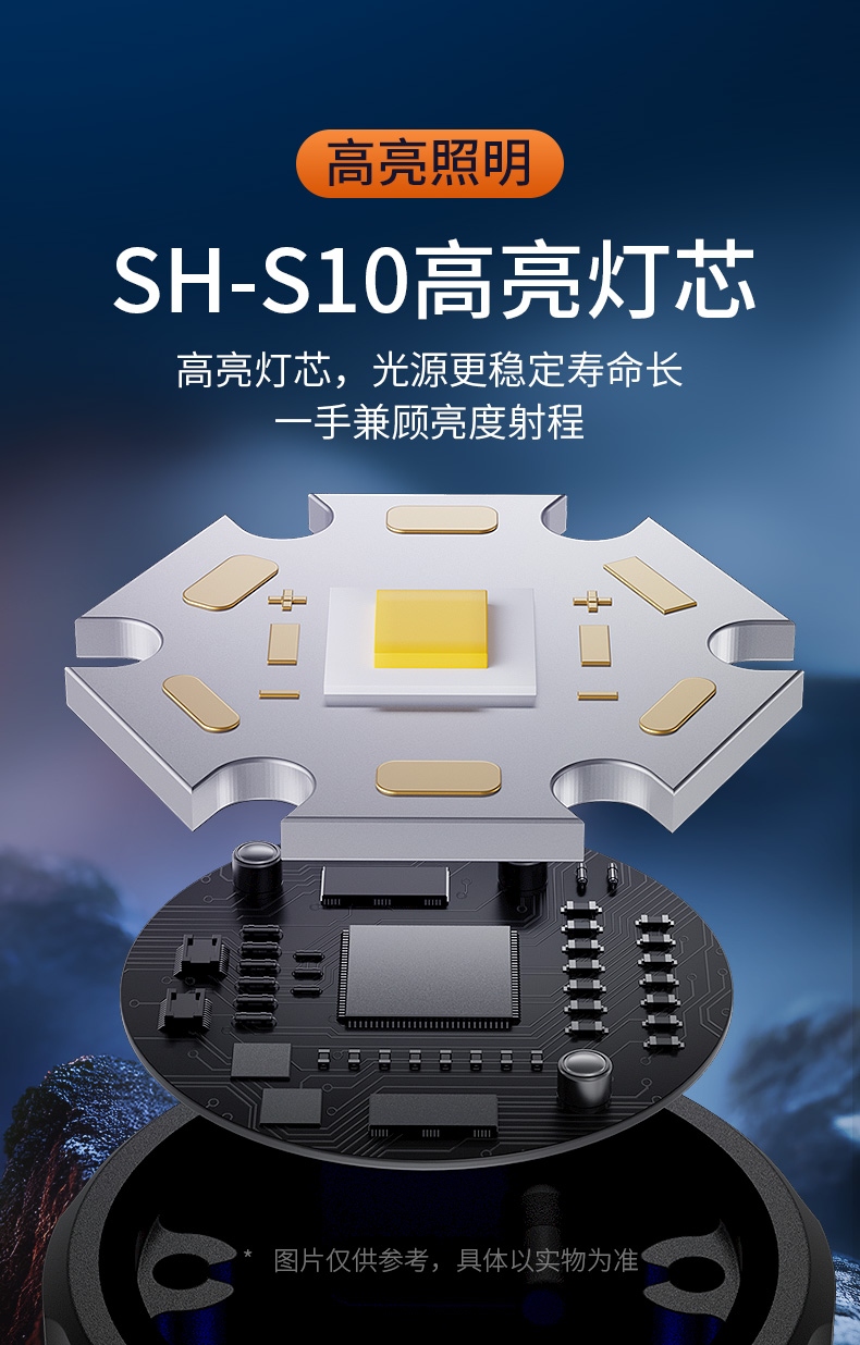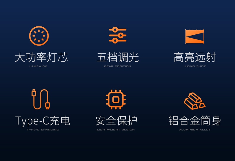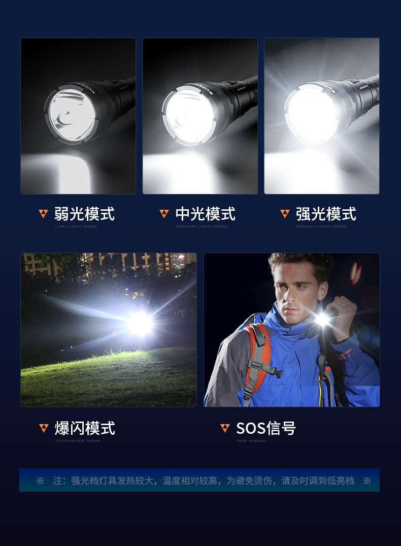 高亮遠射,大功率燈芯;大容量,7000毫安充電鋰電池;超長續航,高亮檔可使用5.5H以上;