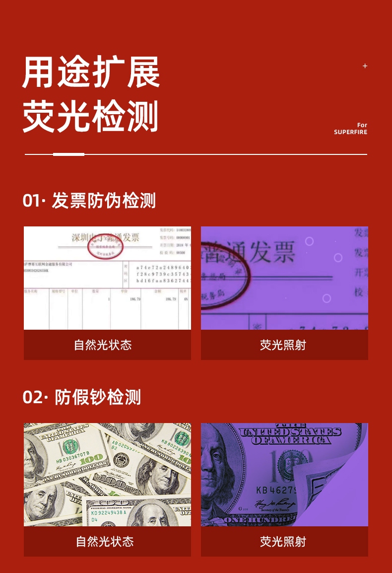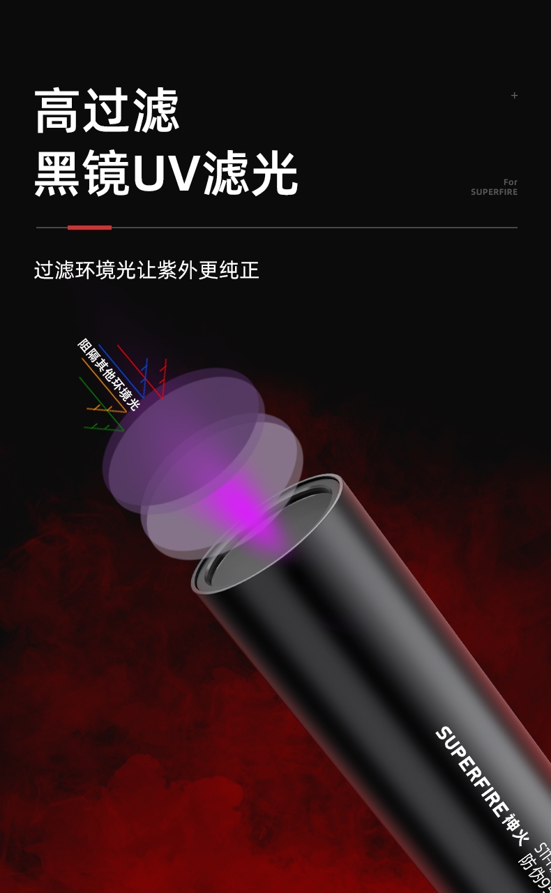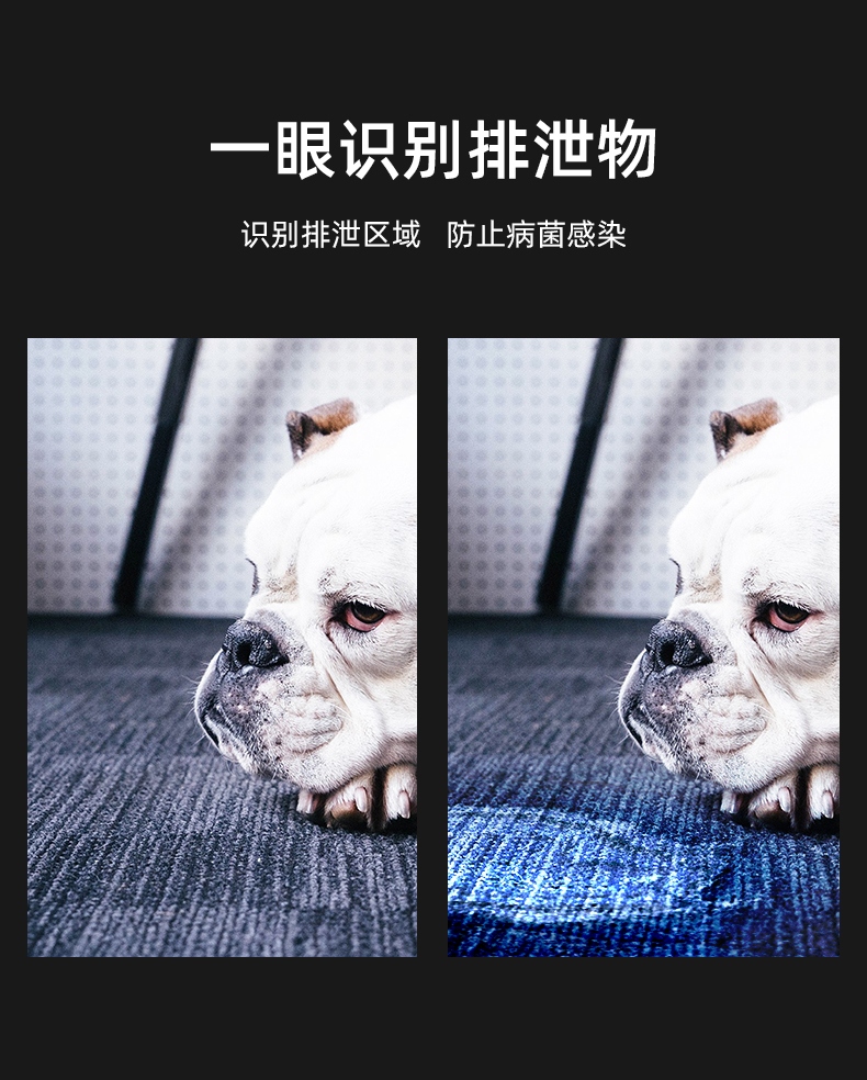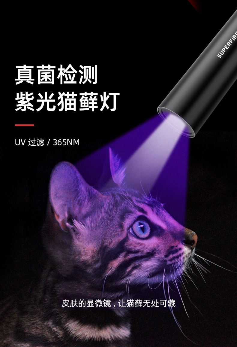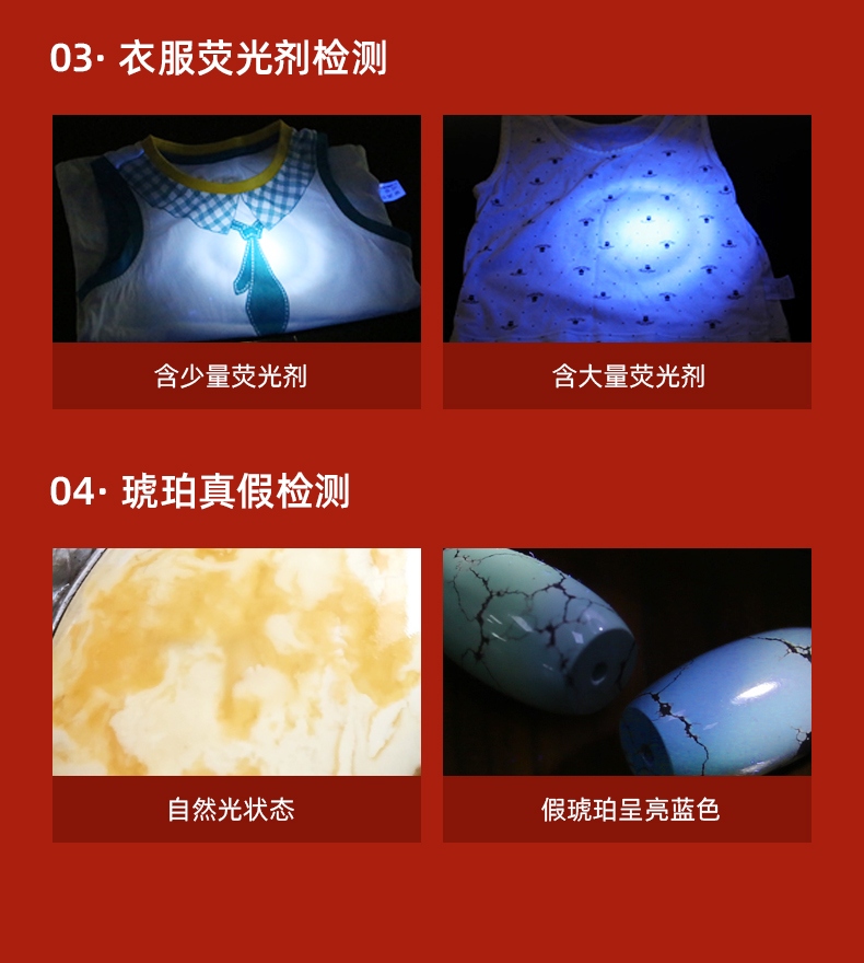 此款365紫外線燈,紫光驗真?zhèn)危瑱z測熒光劑,采用黑鏡可照寵物蘚,寵物尿液,皮膚檢測等. (注意:本款產(chǎn)品照在手上和桌子上顯示微弱的白光,照在白紙上顯示紫光)