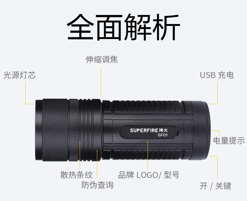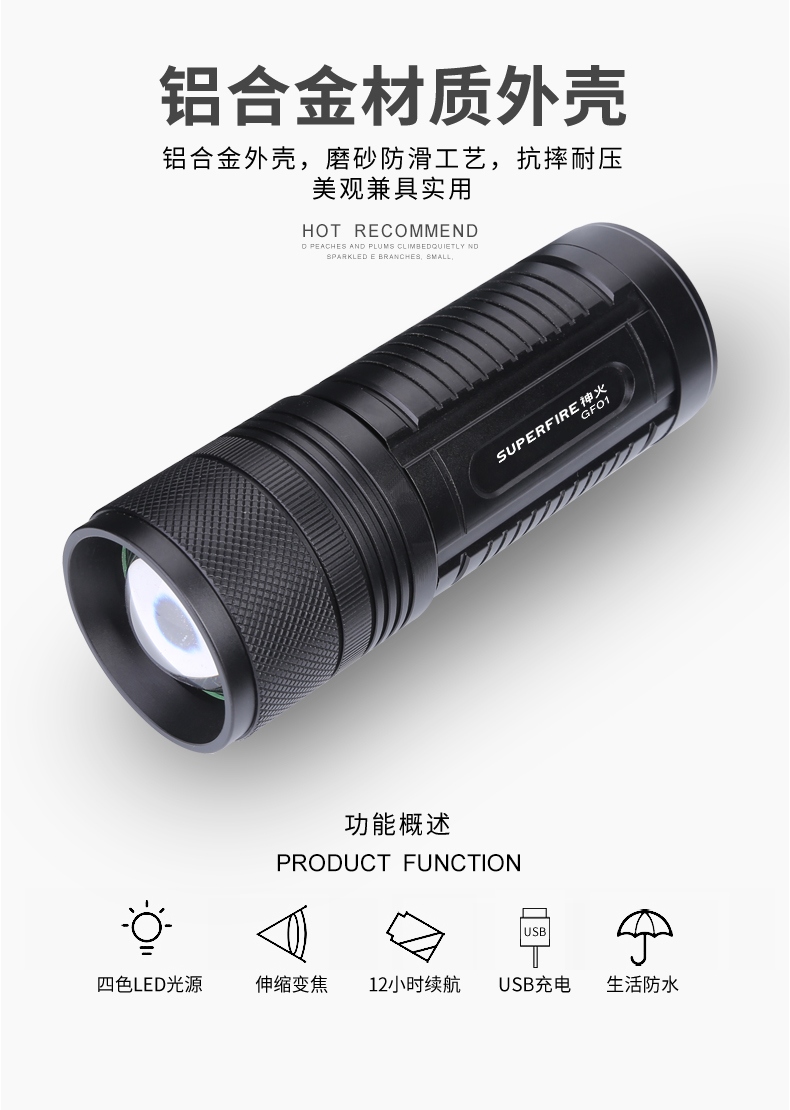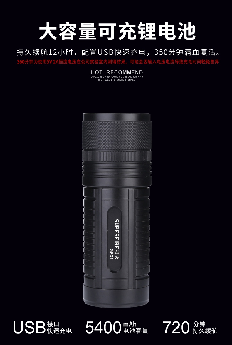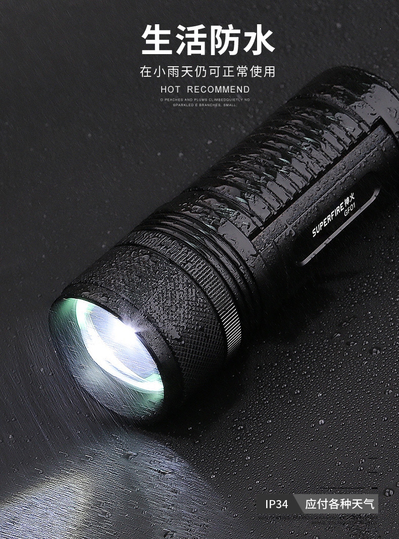 1、千米遠射,射程更遠,光斑更聚焦。 2、進口燈珠,亮度高,照明效果更好。 3、前后雙按鍵,光源一鍵點亮,高亮瞬間開啟。