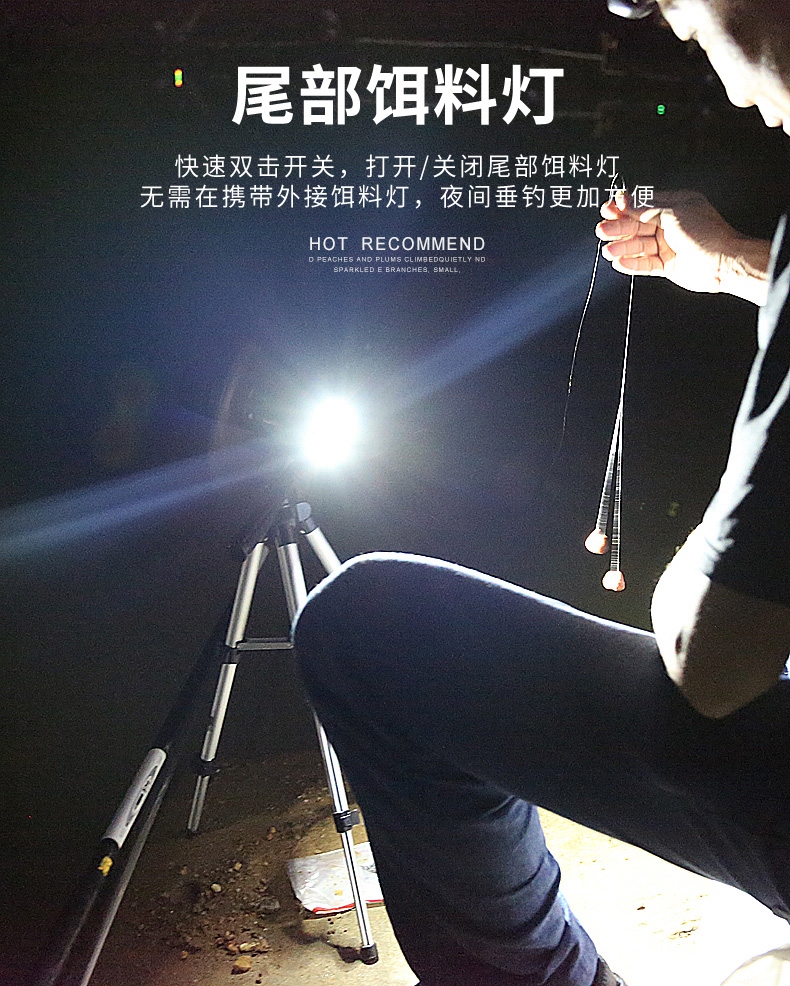 專業釣魚燈,可調焦(4種光源:白光、黃光、藍光、紫光),尾部帶餌料燈,帶電量顯示,可搭配三角架使用,性價比超高。