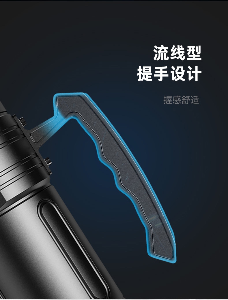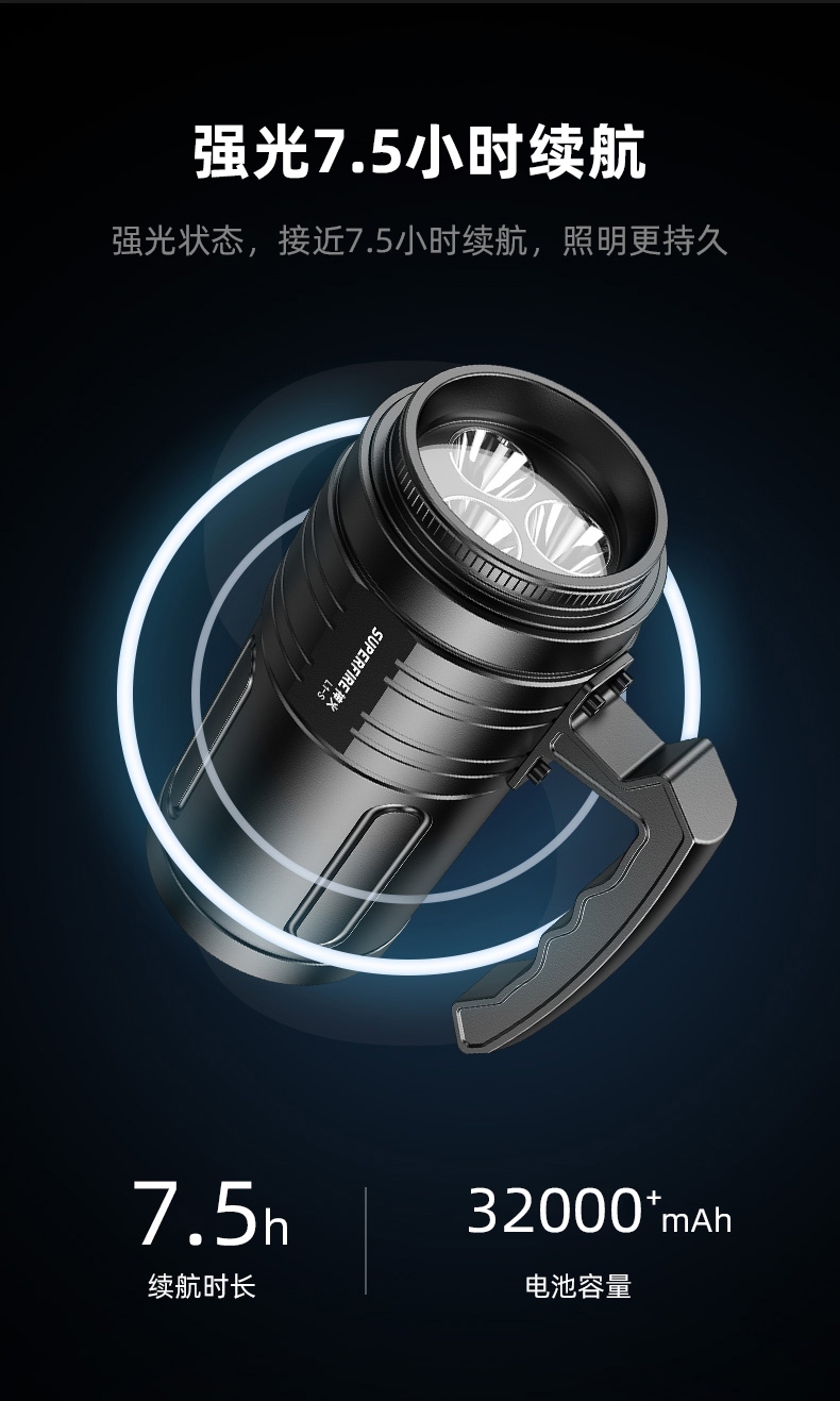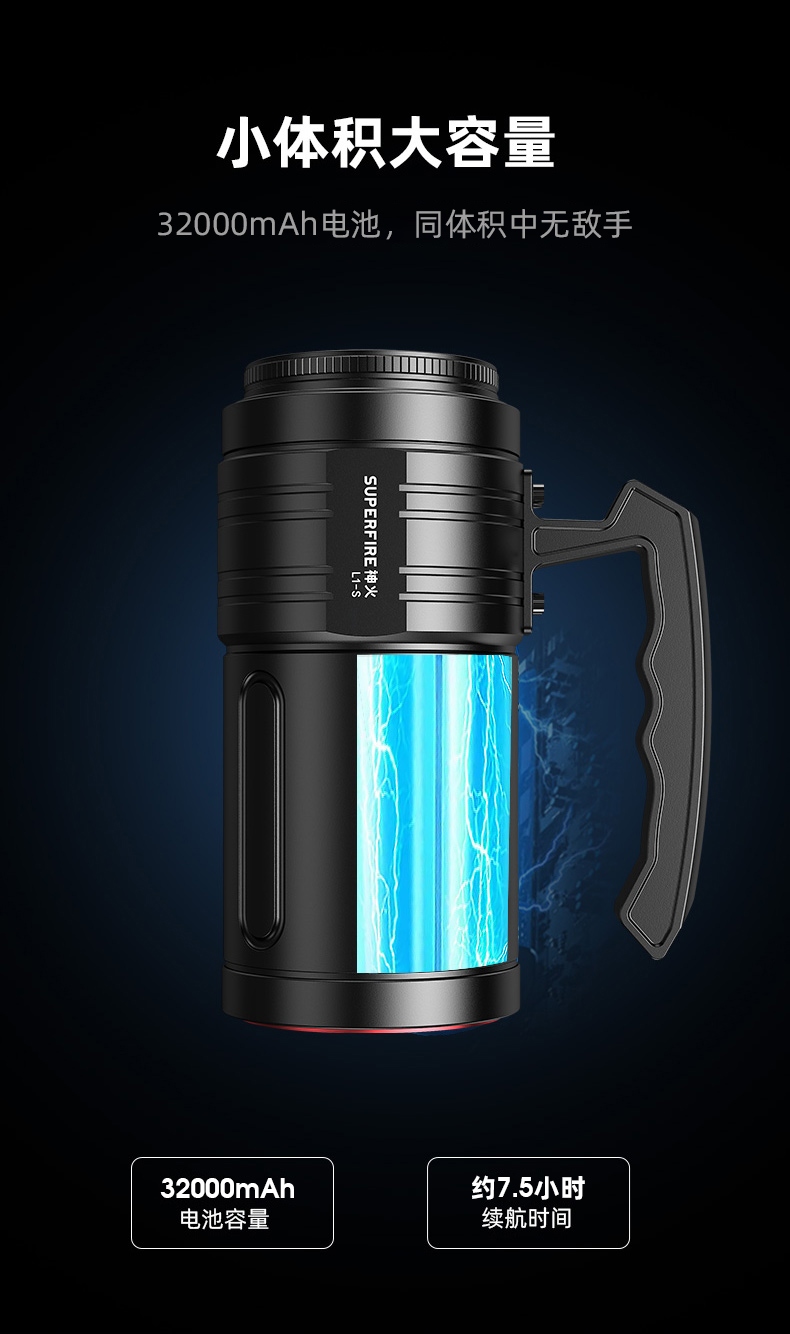 1、超高亮探照燈,最高亮度可達(dá)10500lm,大容量32000mAh電池;